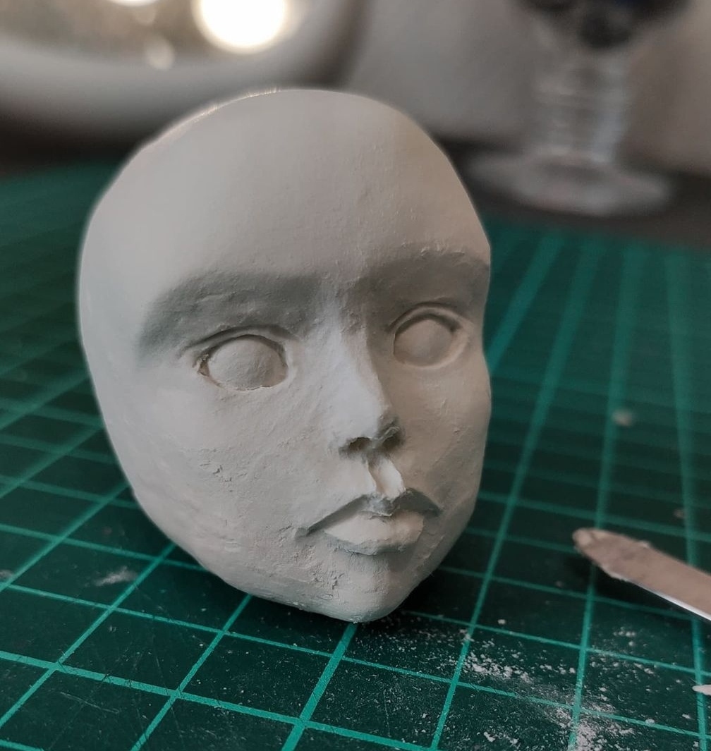 Лицо (а точнее - голова) изначально лепилось для другой куклы, но той не суждено было появиться на свет (я вообще редко довожу кукол до конца, чего уж). Но тут прям жалко стало хоронить его в коробке с остальной расчленёнкой.