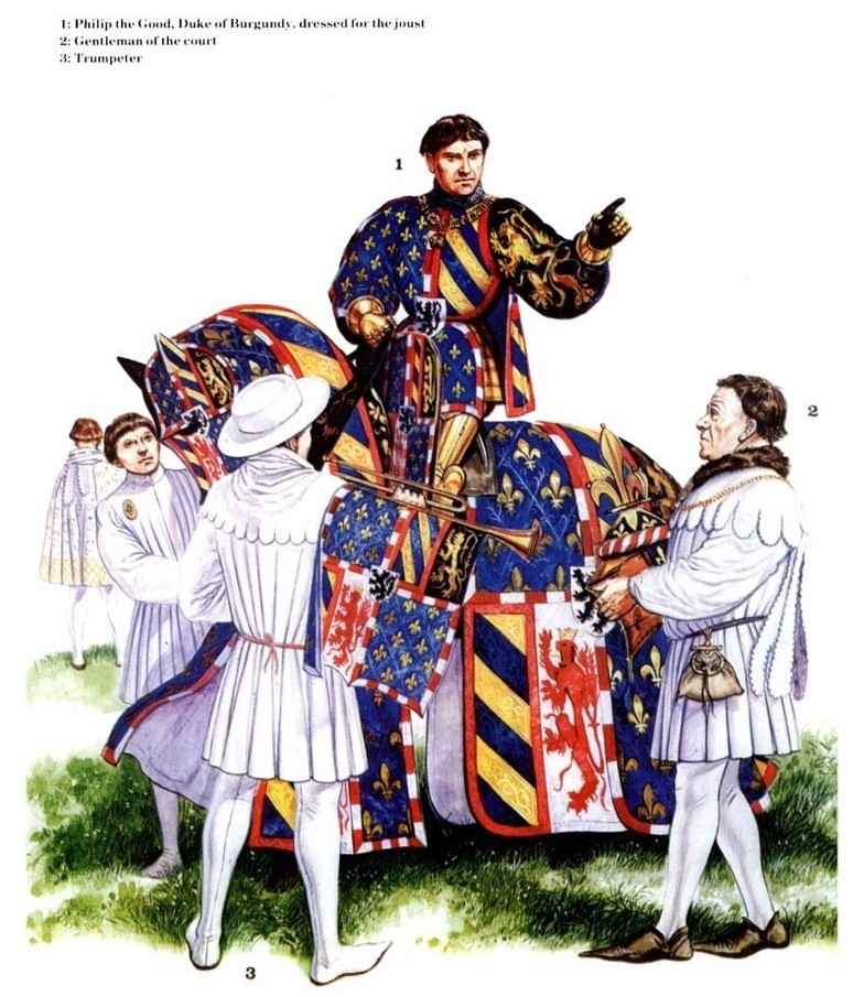 Ну, там еще несколько важных деталей – перья наполовину белого, наполовину синего цвета... Но уставом весь этот сборник пожеланий можно назвать с большим трудом. Зато забавно читать пассажи о том, что герцог Бургундский «пожелал» своим рыцарям, что бы они тренировались движению в строю. Когда не заняты. После обеда. И не пьяны. Хотя бы раз в неделю. И я не шучу, это реальные положения ордонанса. Слегка ломает привычные нам представления об армии, не так ли?