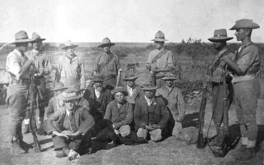 Австралийские солдаты на британской службе взяли в плен капских повстанцев - и те, и другие носят широкополые шляпы и удобную для полупартизанской войны в вельде униформу/одежду схожего покроя.