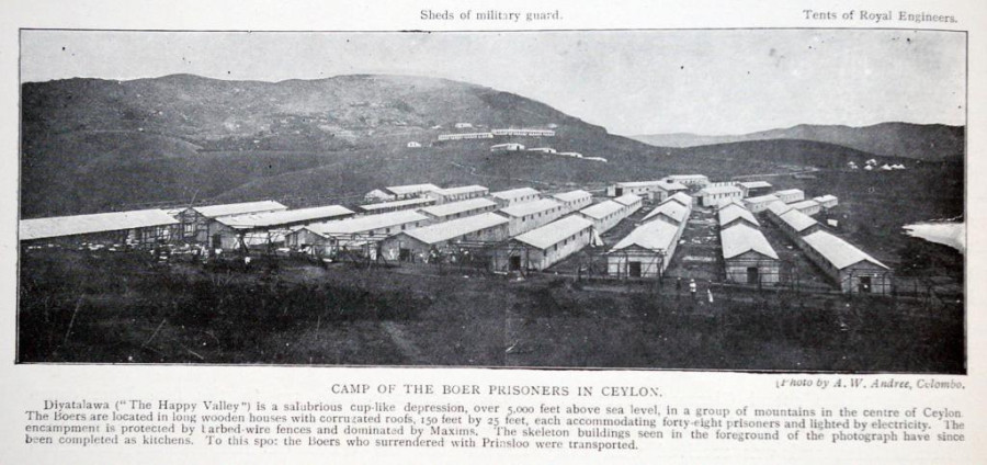 Первая партия пленных прибыла на о.Цейлон 9 августа 1900 года, за ней последовали и другие, пока не высадилось около 5 000 чел. Дияталава был главным лагерем. Гора Лавиния была лагерем для выздоравливающих, а склонных к побегам и непримиримых размещали в Рагаме. В сентябре 1901 года в Уругасманхандии был открыт лагерь для условно-досрочно освобожденных из плена. Хамбантота также был лагерем для условно-досрочно освобожденных.