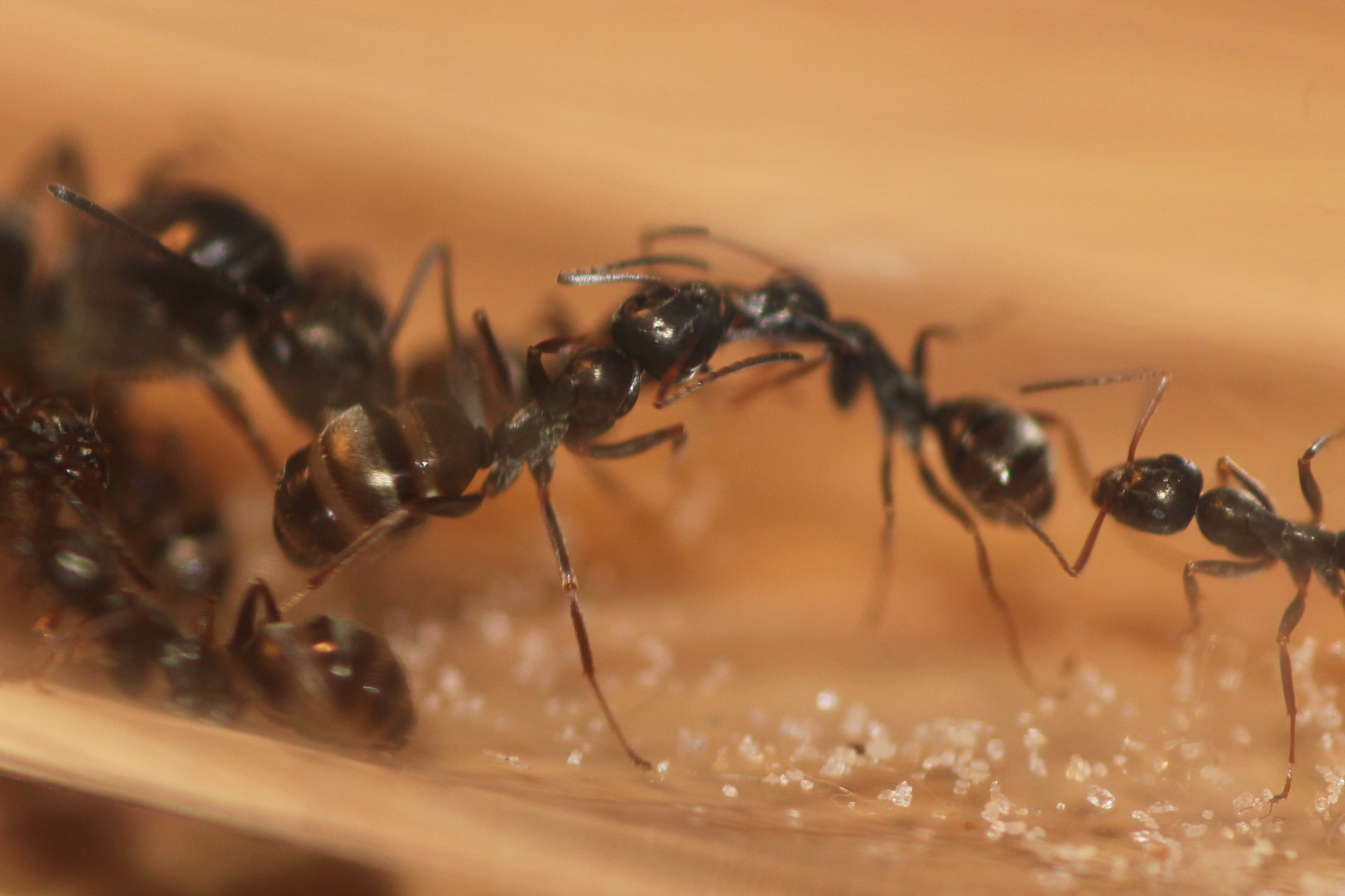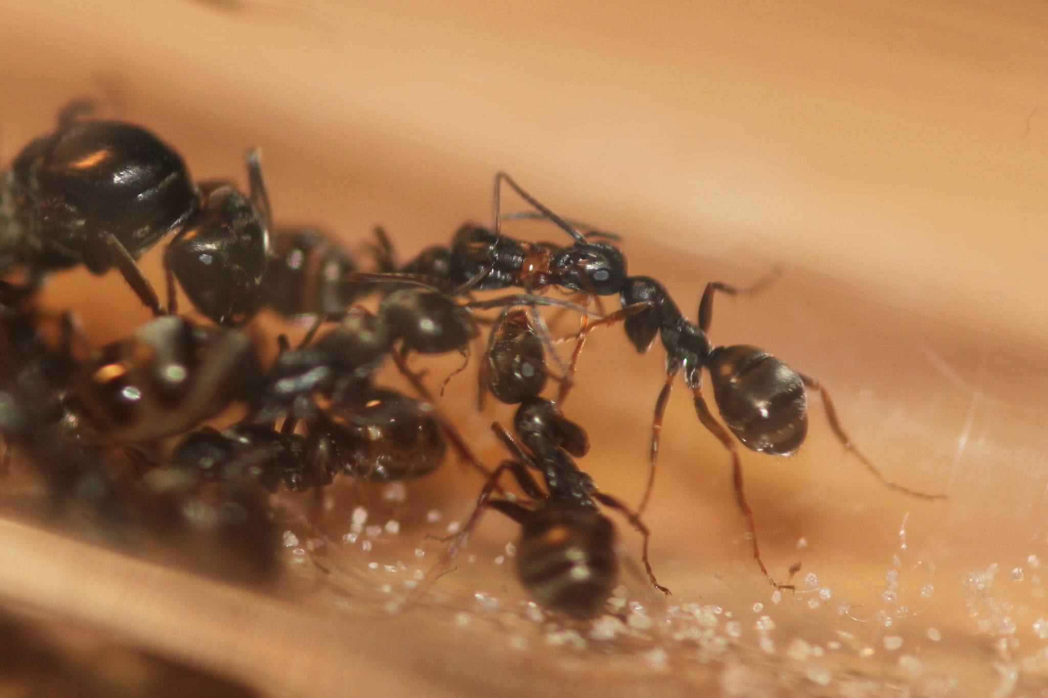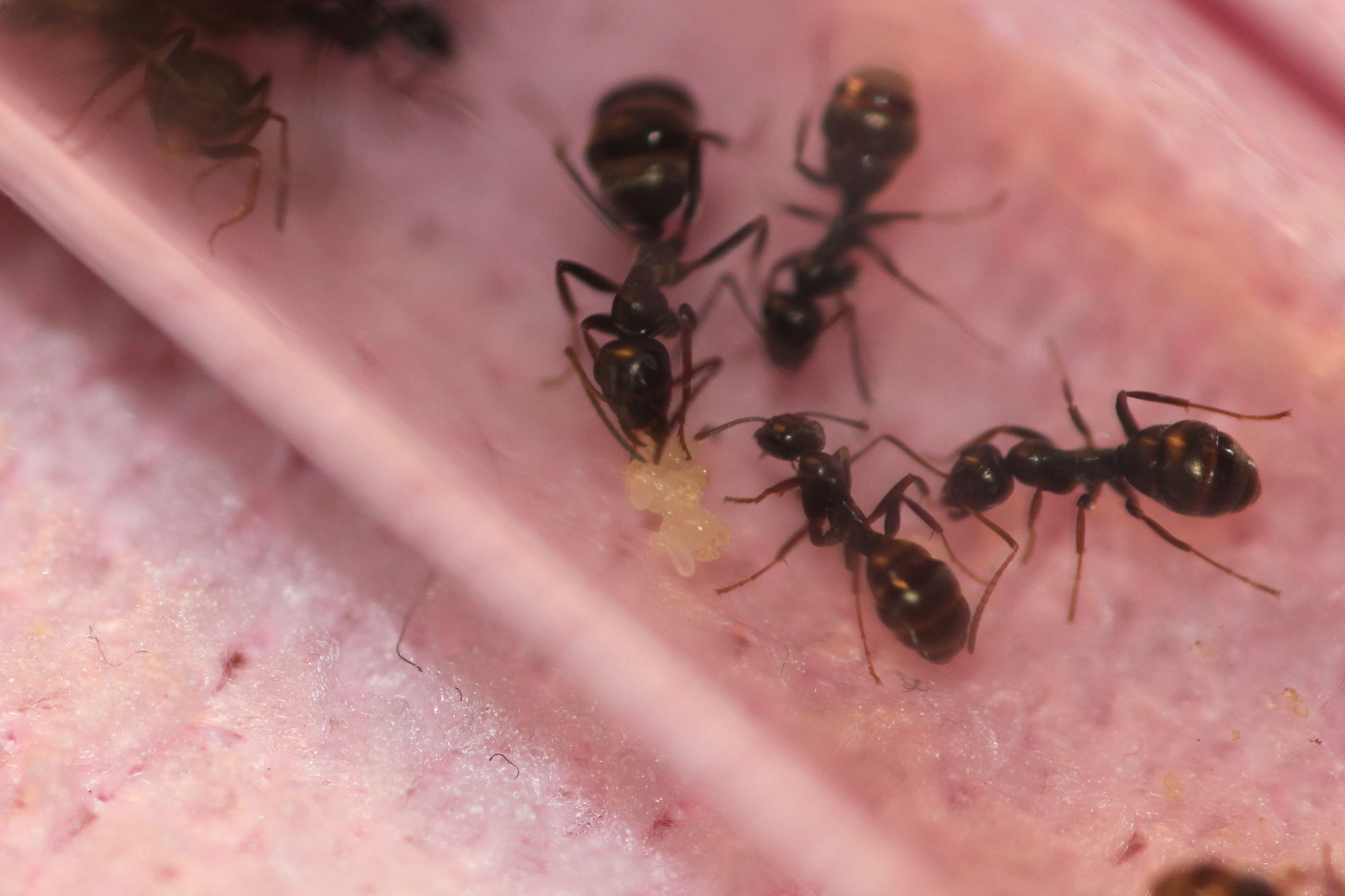 Накормил фусок большим количеством сиропа и дал личинку жука-знахаря, которую затащили к матке, но, видимо, забыли, как вскрывать ее панцирь. Поэтому пока просто озадаченно разглядывают добычу.