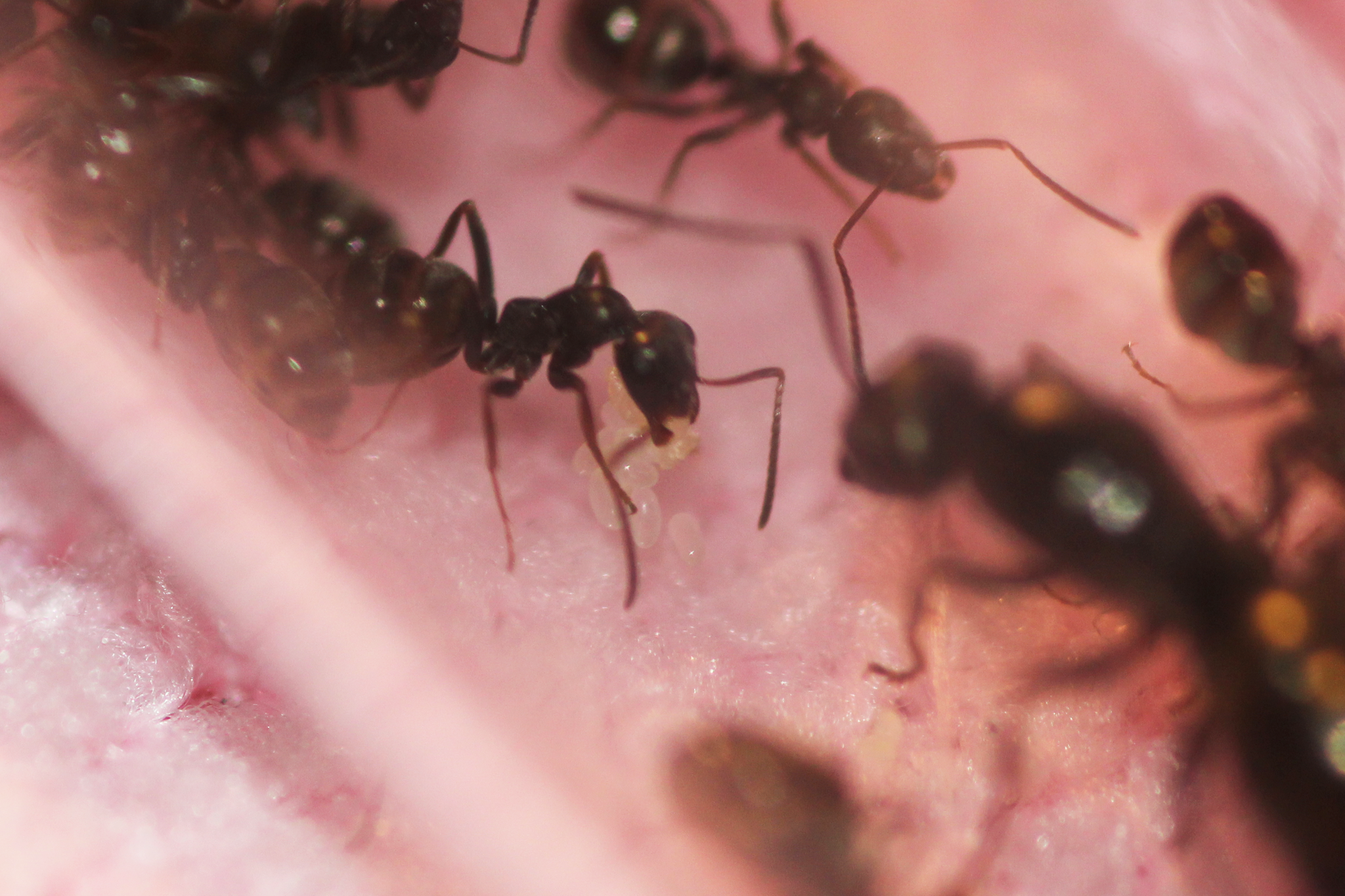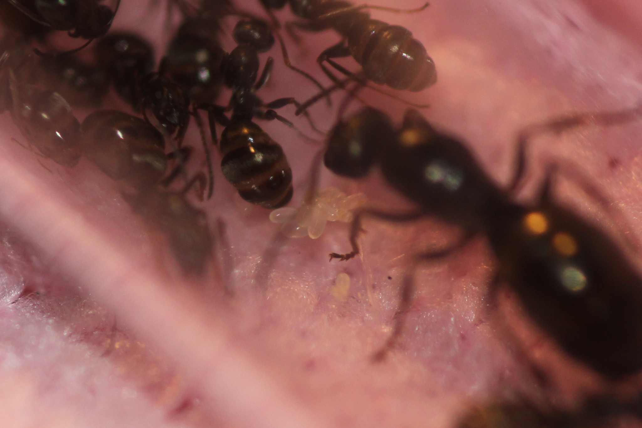 Так же фуски получили сиропа из тростникового сахара. Он им очень понравился, как и круентатусам. Упилась вся семья, все сидят довольные и раздутые. Помимо этого угощения, я предложил им разделанную куколку жука-знахаря, всё же с той личинкой у них не очень получается – никак не могут нормально вскрыть ее броню. Куколку тут же утащили в инкубатор к матке. А личинку знахаря держат в другой пробирке, где сидит группа рабочих и периодически ее подгрызает.
