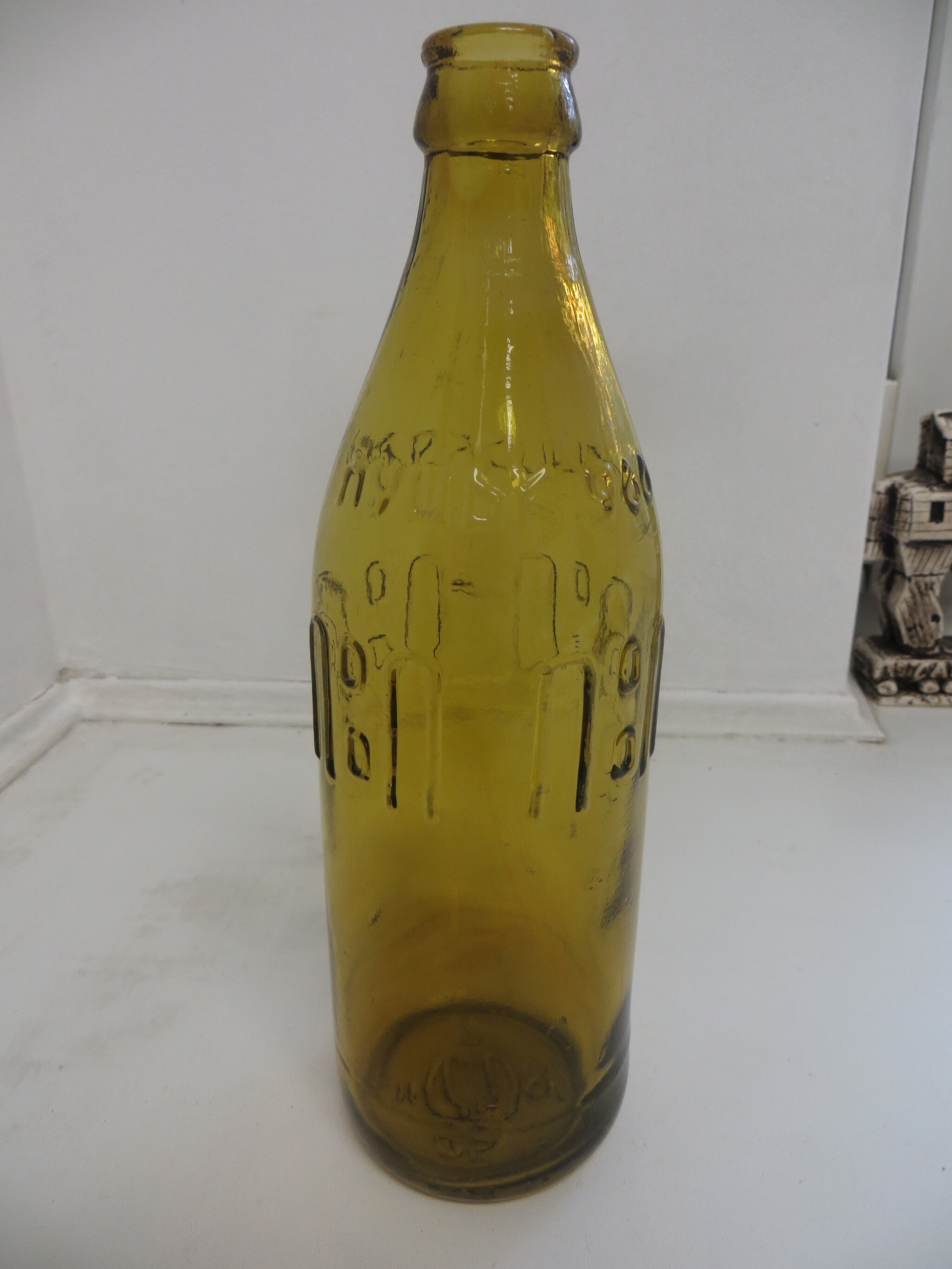 Но это не самое главное, на мой субъективный взгляд. Важнее то, что сам рисунок на этих двух бутылках отличается друг от друга, хотя концептуально они и схожи. На первой бутылке рисунок, как бы сказать, кривулька корявенькая, а вот на второй уже ровненький, красивенький и аккуратненький. Кстати, и предыдущие и эти бутылки выпущены на одном и том же Песковском стекольном заводе в одно время. Рискну предположить, что над дизайном бутылок работали разные мастера. И если с русским вариантом сложностей не возникло, то с украинским вариантом, похоже, что возникли и пришлось запускать в производство не доработанный вариант и дорабатывать его уже по ходу производства. Т.е. что-то похожее на экспериментальную модель. Вероятность такой версии подтверждает и тот факт, что оба варианта этой бутылки были выпущены ещё и в другом цвете.