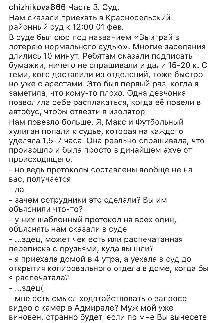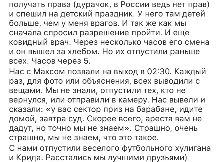 20 к, 10 часов в отделе, 7 часов в суде стоили того, чтобы увидеть, что не все космонавты агрессивны, не все менты бесчеловечны, не все митингующие отбиты. Стоило того, чтобы слушать их смешные истории из детства. Видеть, как каждый делит свою передачку на всех, будто мы лучшие друзья. Отдает по кругу последний неразряженный телефон, чтобы люди могли позвонить близким. Пытается поднять настроение тем, кто расклеился. Слышать: «пап, ты только маме не говори, она расстроится, «Товарищ майор, съешьте тоже бутерброд, вы же с нами тоже без ужина сидите», «А можно портрет Путина отвернуть к стене, он смотрит и мешает уснуть», «Ребята, диабетиков нет? Могут привести инсулин и питание».