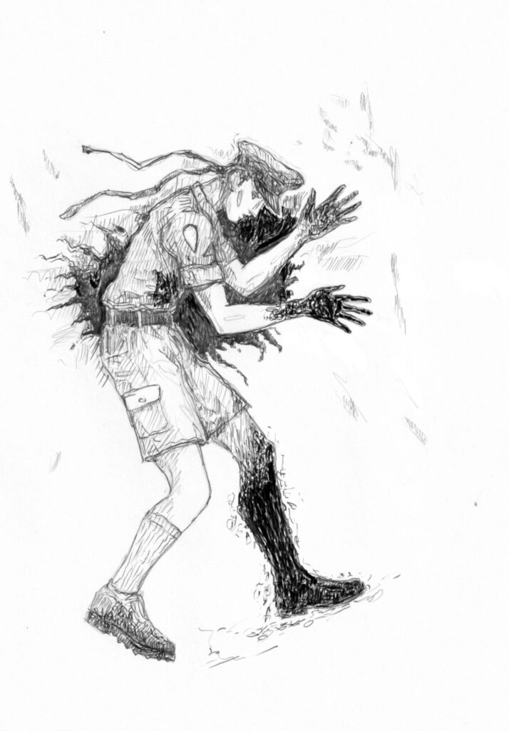 Ореховый приклад разлетается в щепки, долговязый плавно заваливается набок, но продолжает елозить по полу, как издыхающая змея. Мамонт-Ной сипло дыша отползает от богомола. Шарит рукой под креслом, нащупывает и достаёт оттуда свой отлетевший в схватке пистолет — охотничий коловрат. Долговязый ещё дышит. Ной наводит на него пистолет, тот щёлкает пустым барабаном. “Подожди, подожди”, — шепчет Мамонт-Ной, достаёт патроны из кармана своего охотничьего жилета и принимается заряжать. Готово. Целится и разряжает в голову богомола полный барабан, пять утяжелённых пуль на вепря и медведя. Но и от них голова не разлетелась, как можно было бы ожидать, от выстрелов она только дёргалась на шее, как на верёвке, будто внутри неё стальной шар. Всё же богомолу хватило свинца, и он затих.