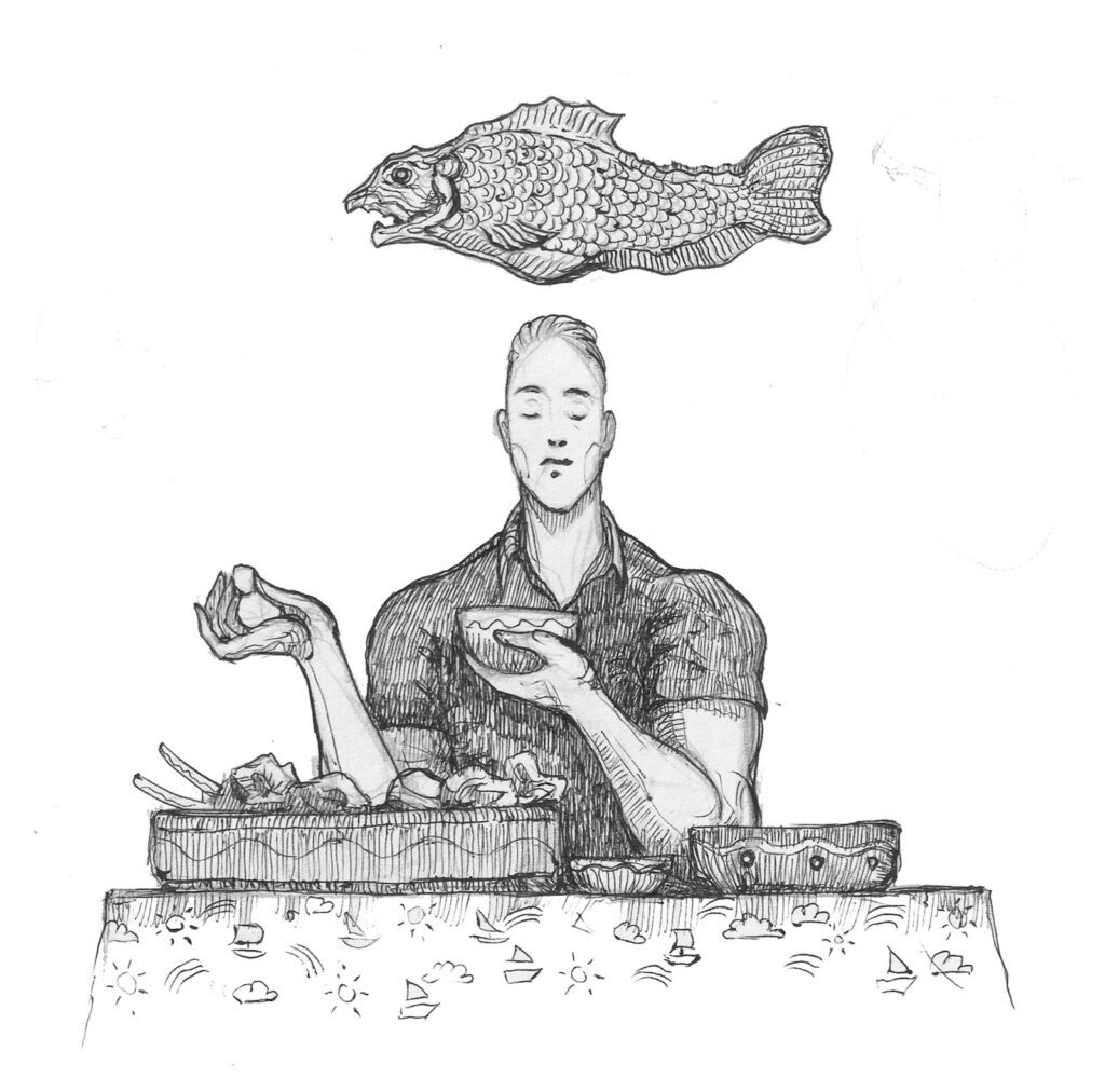 С кухни здорово пахло жареным мясом, луком, чесноком и бараньим жиром. Тёмный зал с нерабочим потолочным вентилятором, духота, захватанная занавеска едва шевелится душистым сквозняком из кухни. Всё прокурено и покрыто толстой патиной сажи, табачных смол и жира. Липкие клеёнки с почерневшими ворсистыми порезами, следами кружек и корабликами на волнах. Одинокое жужжание мухи и бухтение старого пивного холодильника. На двух соседних столиках десять пустых кофейных чашек и скомканные салфетки.