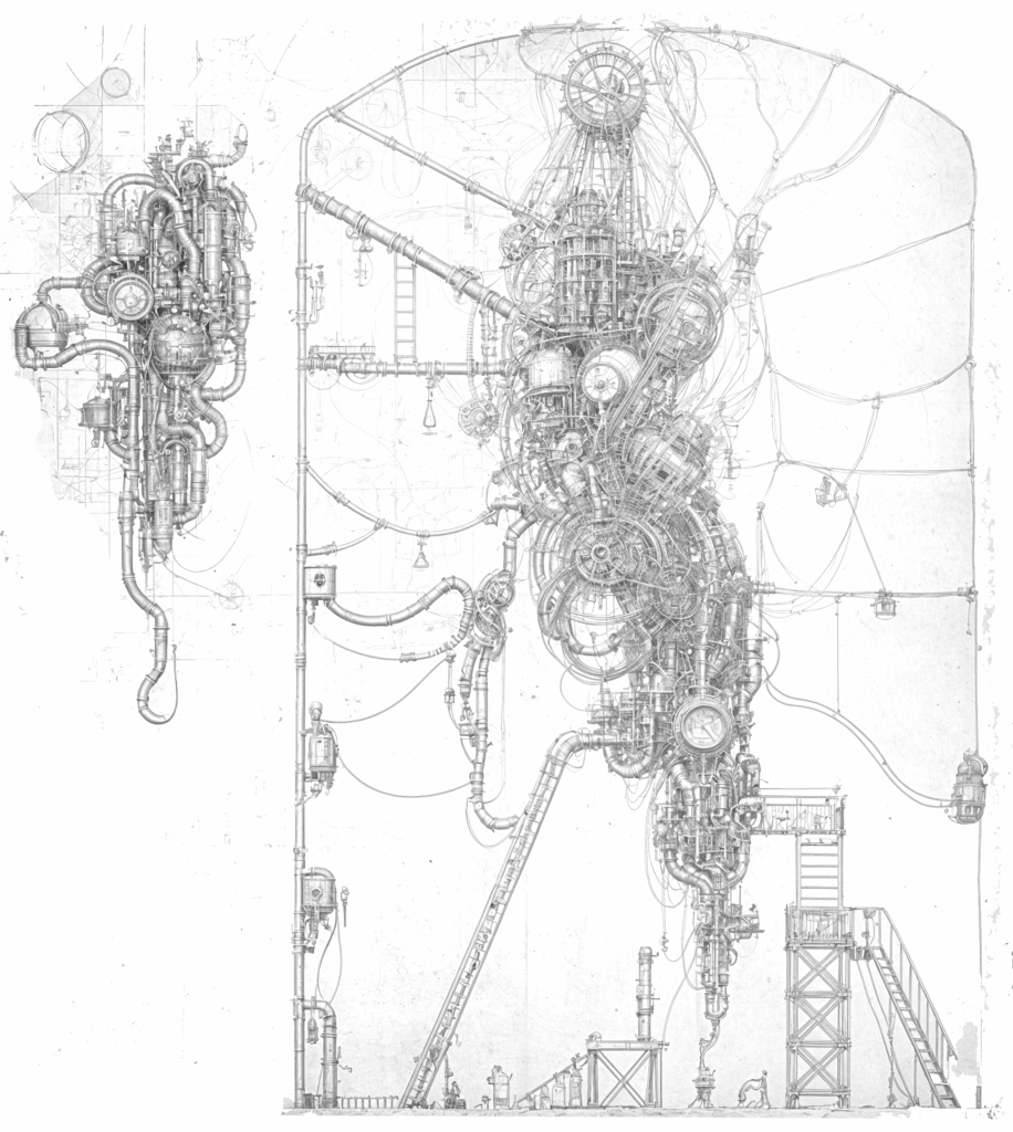 За батареями Машины Цветка возня и пыхтение. С двустволкой наготове, на раскалённых ногах Ягр пошёл на шум. За блоком батарей каблуки охотничьих сапогов стучат по полу. На Мамонте-Ное сидит долговязый, похожий на богомола, он не чувствует тщетного богатырского сопротивления и душит великана. Это как будто схватка деревянного солдата и плюшевого медведя. Богомол давит шею сосредоточенно и со вкусом, Ной затихает.