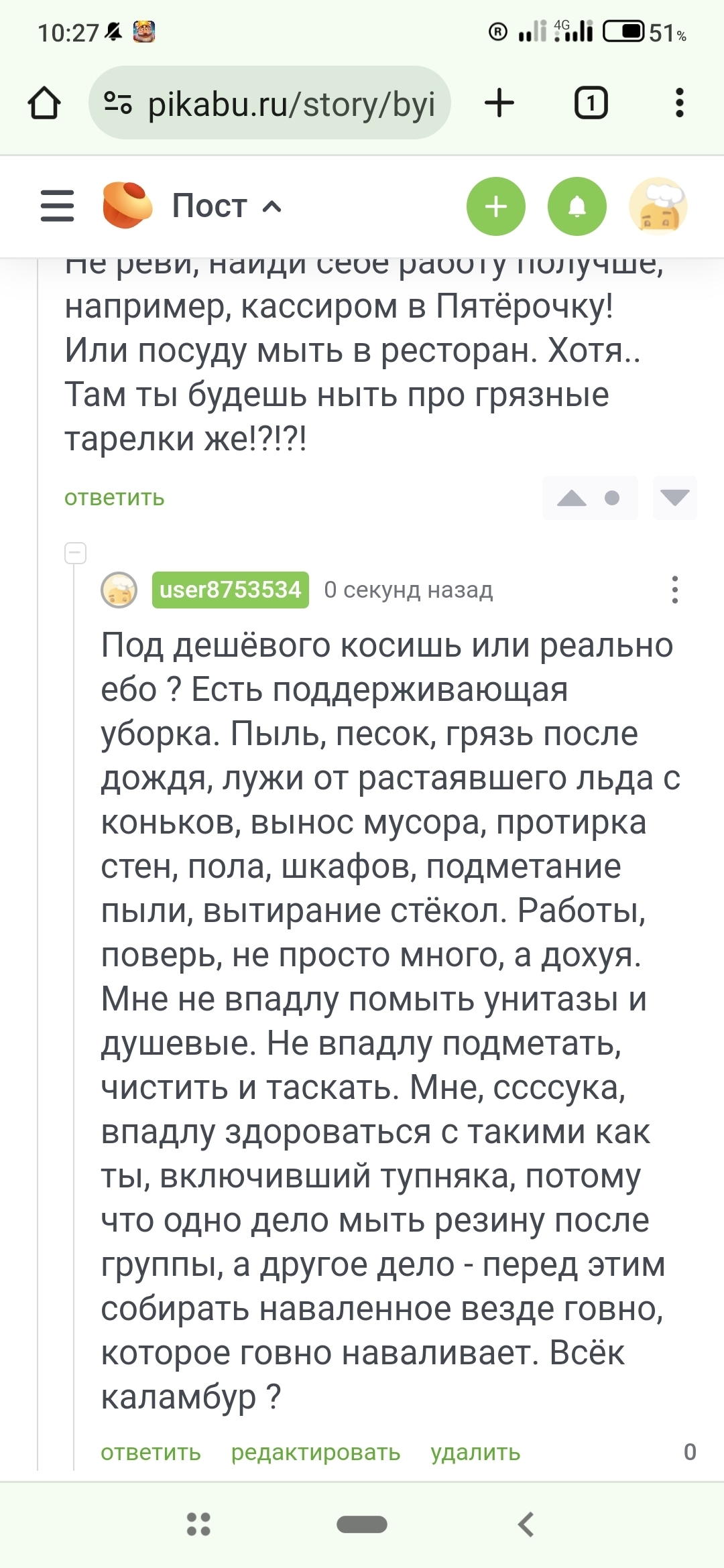 У меня нет права делать быдлу замечания, указывать, скандалить, возмущаться. Я могу только убирать неубранное быдлом говно.