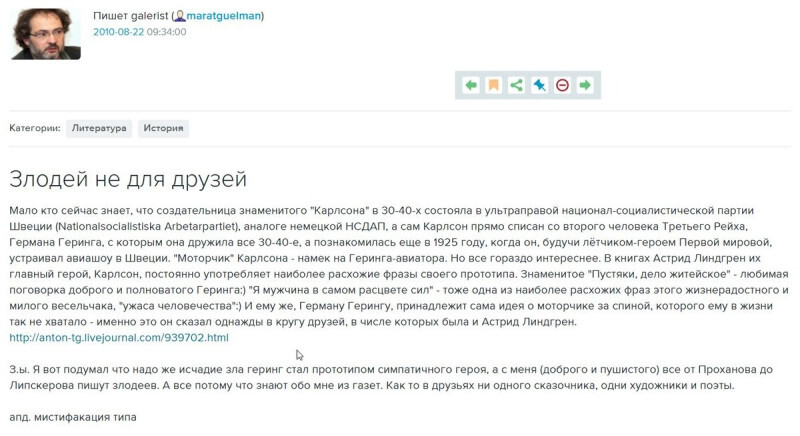 Злые языки, кстати, утверждали, что даже телегу про Карлсона Спасихристосантоний придумал не сам, а сплагиатил у нижегородских нацболов. Мол, за два года до этого, в 2008 году газета нижегородского отделения НБП, напечатала под каким-то левым псевдонимом статью, где сюжет Карлсона был запараллелен с историей 3-го Рейха. Мол, Малыш символизирует Гитлера, Карлсон - Геринга, фрекен Бок — это Рем, а мама Малыша — почему-то Гинденбург (все было здесь, но ссылка давно уже не работает - http://narnab.nbp-info.com/nomera/58/karlson-kak-arhetip-nacista-v-shvedskoj-literature.html).