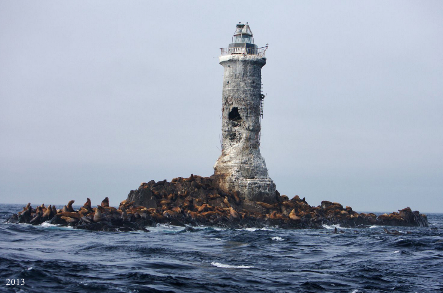 Разрушенный маяк на скале Камень опасности (Сахалин): теперь здесь встречаются, влюбляются и женятся морские львы - сивучи. В гареме одного самца могут быть до 20 самок.