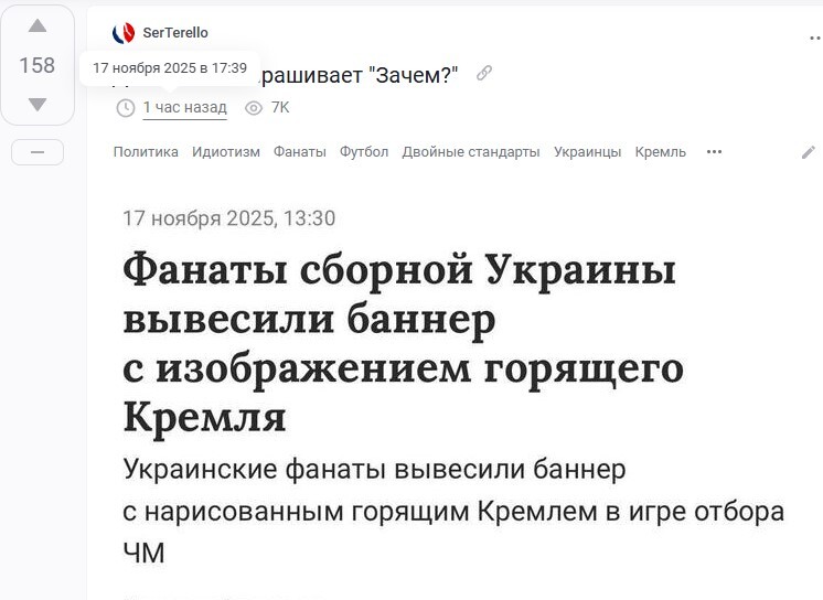 26 Есть официальный ответ Habanero Модерация на Пикабу Политика Был пост и нету... 2 месяца назад Можно пояснительную бригаду? Вопроса два - за что снесли пост и почему одни творят лютую дичь, а сносят пост того, кто показал на тех, кто эту дичь несёт? [моё] Вопрос Спроси Пикабу Ответ на пост Политика Общество Украина Футбол Болельщики Ещё 0