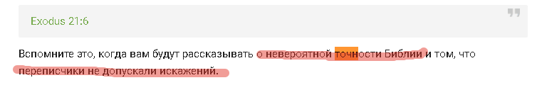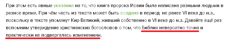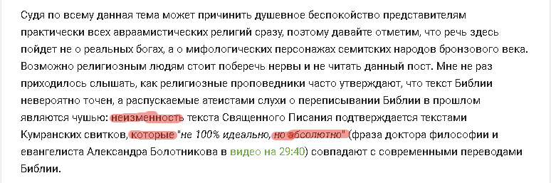 Далее, в качестве подтверждения своих слов о том, что верующие считают Библию абсолютно точной, наш автор приводит искажённую цитату адвентистского пастора Александра Болотникова, который рассказывая о кумранских текстах и явно оговорившись, произнёс фразу "не 100% идеально, но абсолютно", очевидно имея ввиду, что идеального совпадения всё же не было. Однако наш автор зацепился за эту оговорку и процитировал её в качестве подтверждения своей мысли и как доказательство тупости верующих.