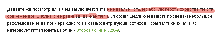Давайте же посмотрим, в чём заключается эта не идеальность, но абсолютность сходства текста современной Библии с её ранними вариантами. Откроем Библию и вместе проведём небольшое расследование на примере одного из самых интригующих стихов Торы/Пятикнижия. Нас интересует пятая книга Библии - Второзаконие 32:8-9.