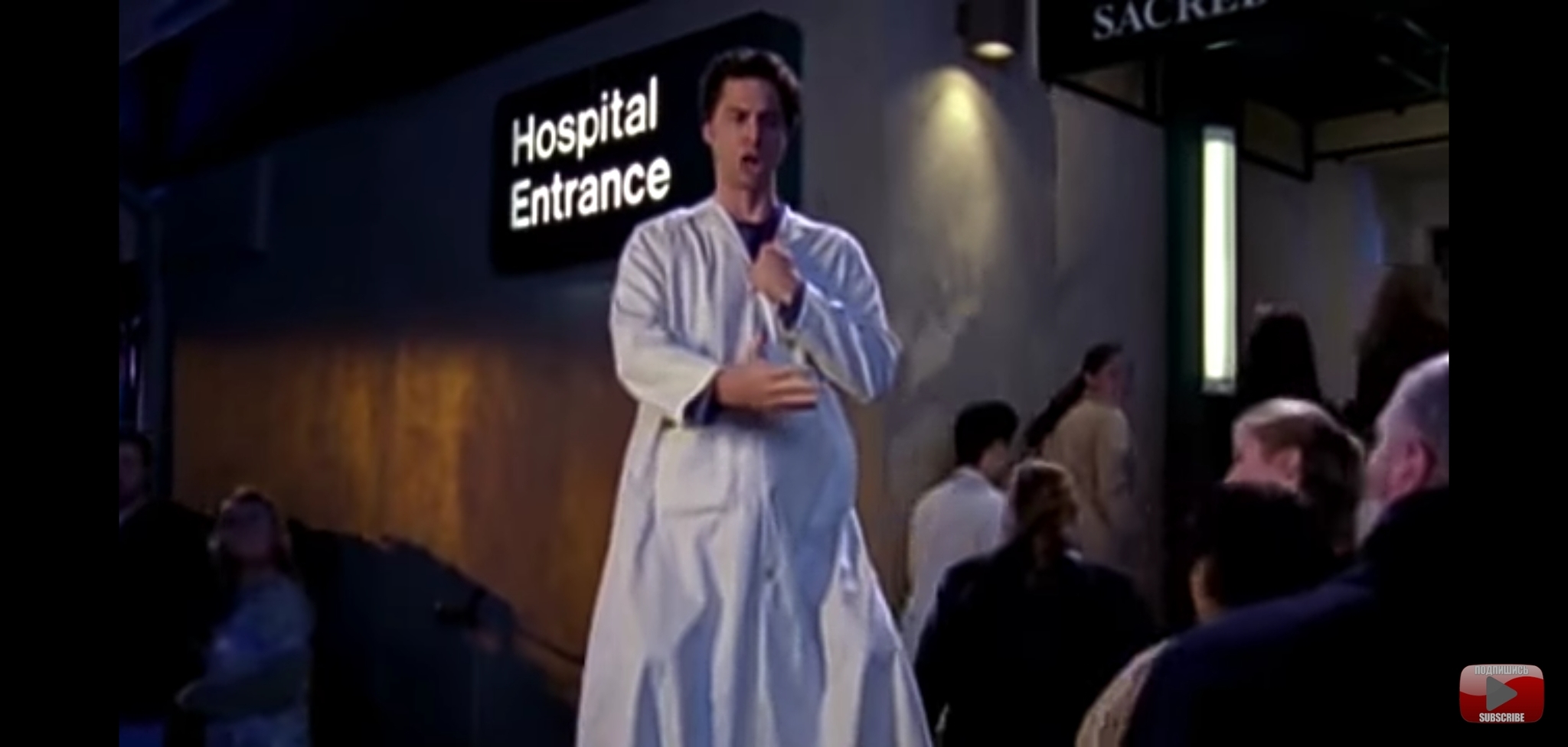 ДжейДи изображает огромного доктора на входе. У него начинает чесаться жопа и он слазит с плечей Тëрка.