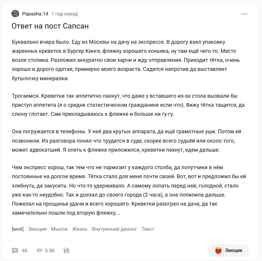 Так там вообще смысл был в том что тётка жрать хотела, а у меня упаковка с жареными креветами на столе. Пью коньяк, а закусывать мне как бы неудобно в присутствии солидной дамы, которая напротив сидит. Ну а собеседница подзавела, поэтому отвечал уже с более суровой иронией. Так что голубушка, ваши претензии ничтожны и недостойны того времени, которое мы потратили на пререкания. Хорошо ещё что у мня творческая бессонница и параллельно пишу роман...