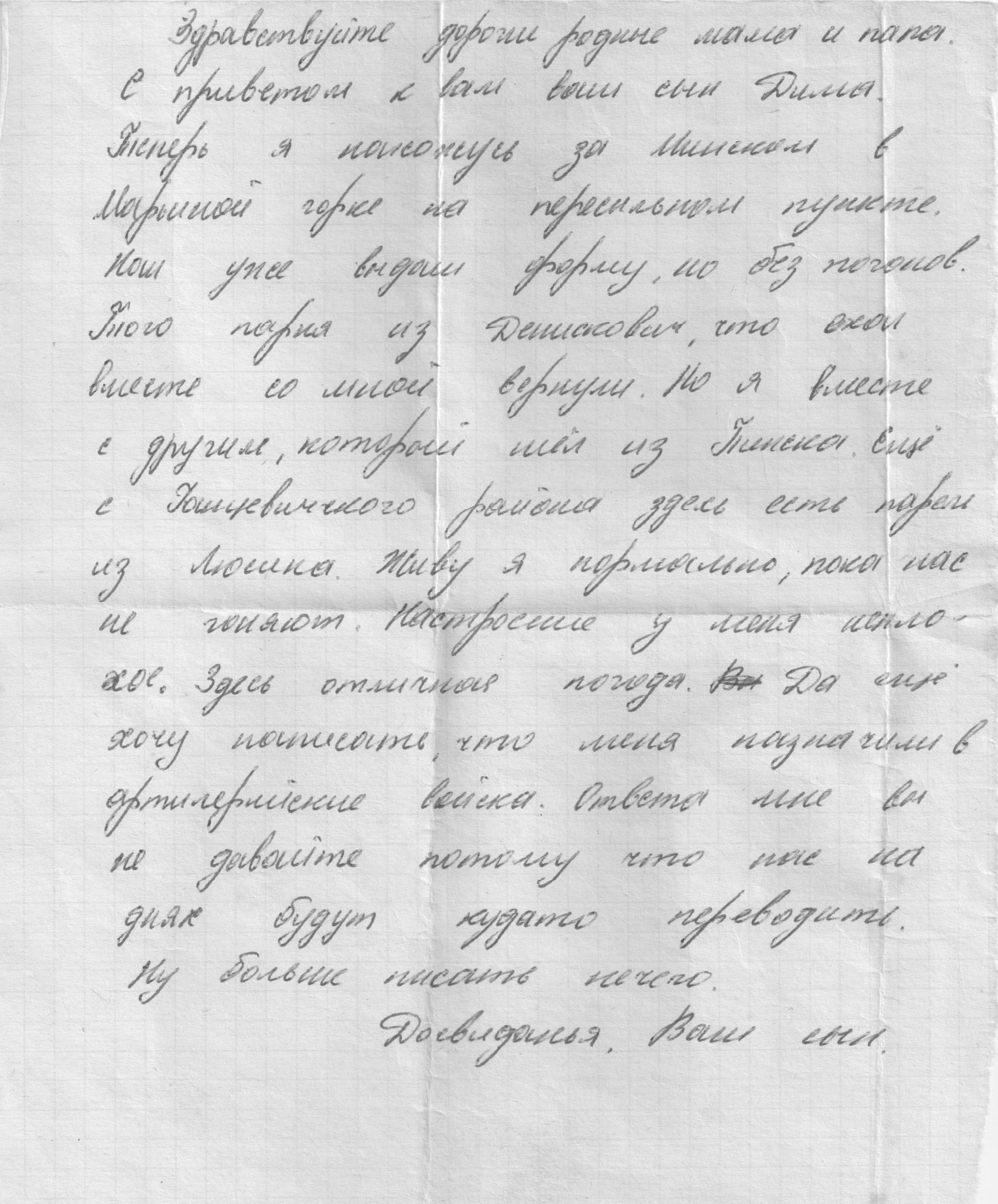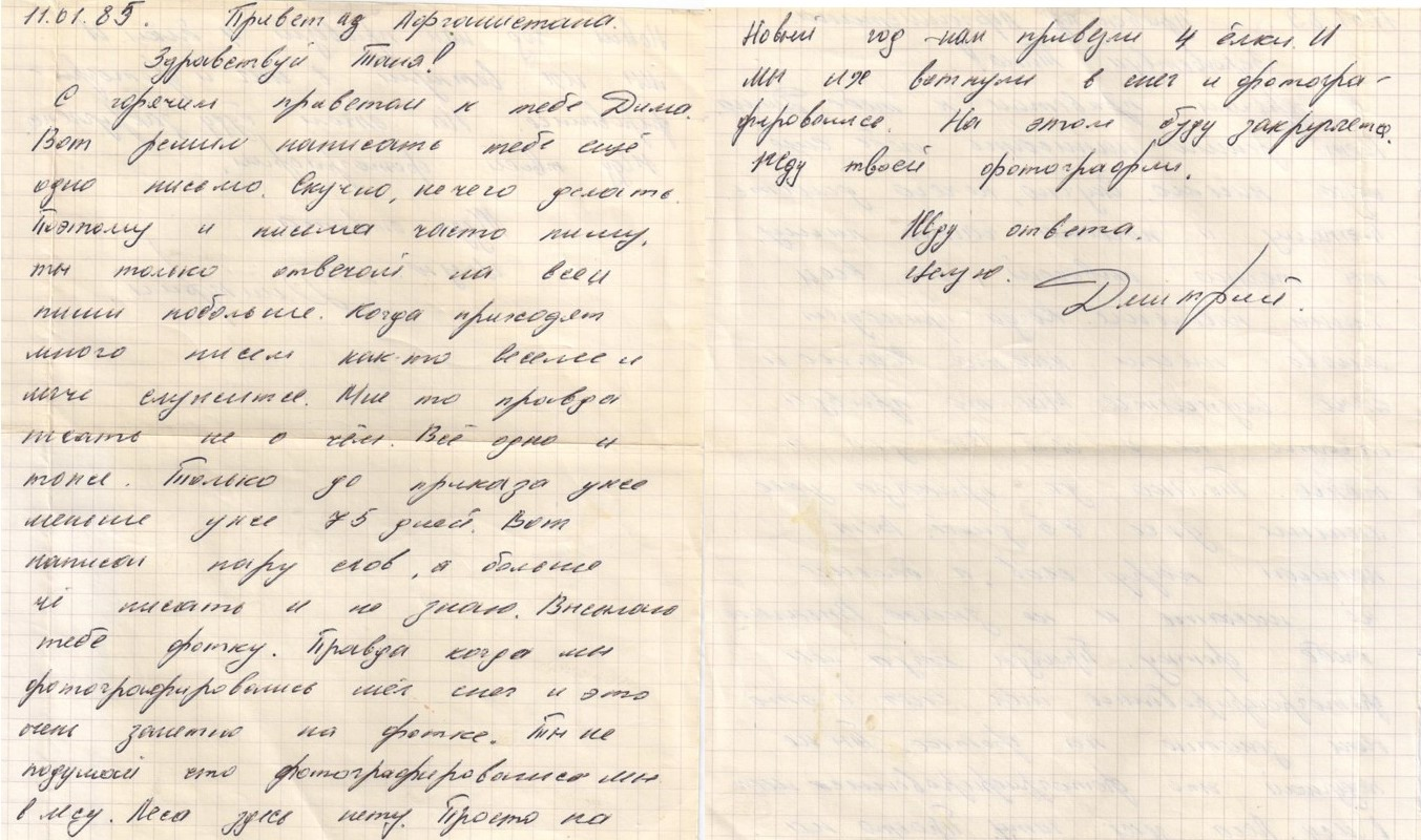 Девчонки из Ляховичского техникума, с которыми я проучился один год до армии, также писали мне письма. Ирина Лымарь, Татьяна Барута, Татьяна Макарченя. Девчонки также умели и знали, какие слова следовало написать человеку в армию, что бы поддержать. От всех писем веяло, теплом, добротой, памятью о таком недалеком прошлом и одновременно как будто из совершенно другой жизни. Самыми дорогими и желанными были, конечно, письма от родителей и моего родного брата. Только там, в Афганистане я, наверное, понял насколько дороги родные и близкие. Я понимал, что меня любят и ждут. И также понимал, что никто и ничем помочь мне здесь не сможет. Поэтому ни в одном из писем и никому я не писал о войне, о гибели товарищей, да и вообще о трудностях армейской службы.