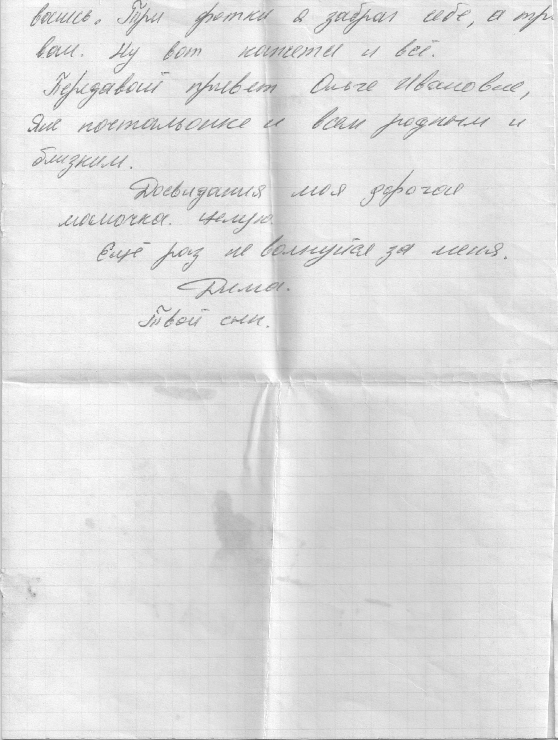 - Дорогие мои, уважаемые, родные товарищи!! Спасибо огромное за все. Я вас помню, уважаю и люблю. Всегда буду ждать весточку от вас и всегда отвечу. Единственное, о чем хочу предупредить и попросить, не присылайте мне впредь, такой "бакшиш". Я никогда больше не притронусь к этому зелью. Пусть это останется там, в Афганистане. У меня уже совершенно другая жизнь, мирная, счастливая, здесь очень много других интересных вещей. А Афганистан, как и это зелье, я хочу забыть, вычеркнуть из своей жизни. Только Вас, ребята, я никогда не забуду!!!