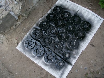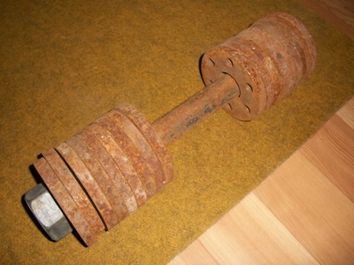 а по сути - когда денег было мало поехал в пункт приема металла, купил ржавое железо, зачистил покрасил - получилась отличная разборная гантелька с шагом в 800 грамм вроде до примерно 20кг макс. с внутренней части металлические хомуты, с внешней зажимается здоровенными гайками (последние 3 фотки).