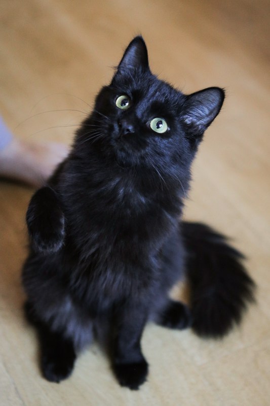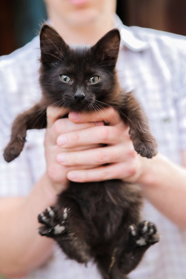 Черный котя теперь живет в частном доме, у любящих и заботливых хозяев. Отлично кушает, играет и исследует большой, двухэтажный дом.