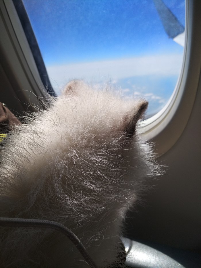 Он отлично себя ведет в транспорте и с удовольствием , как и любой пёс наблюдал в окно за делами в большом мире)