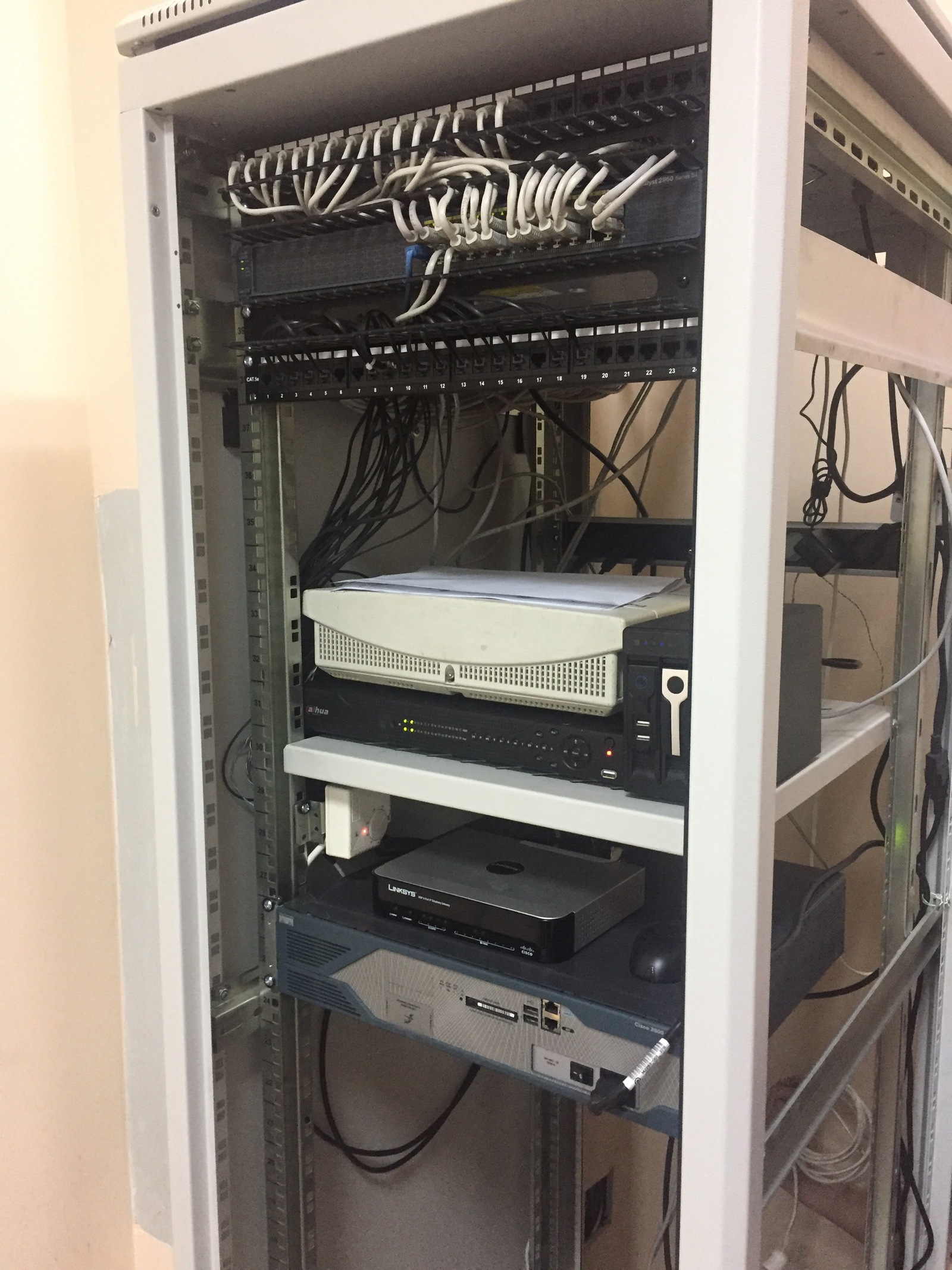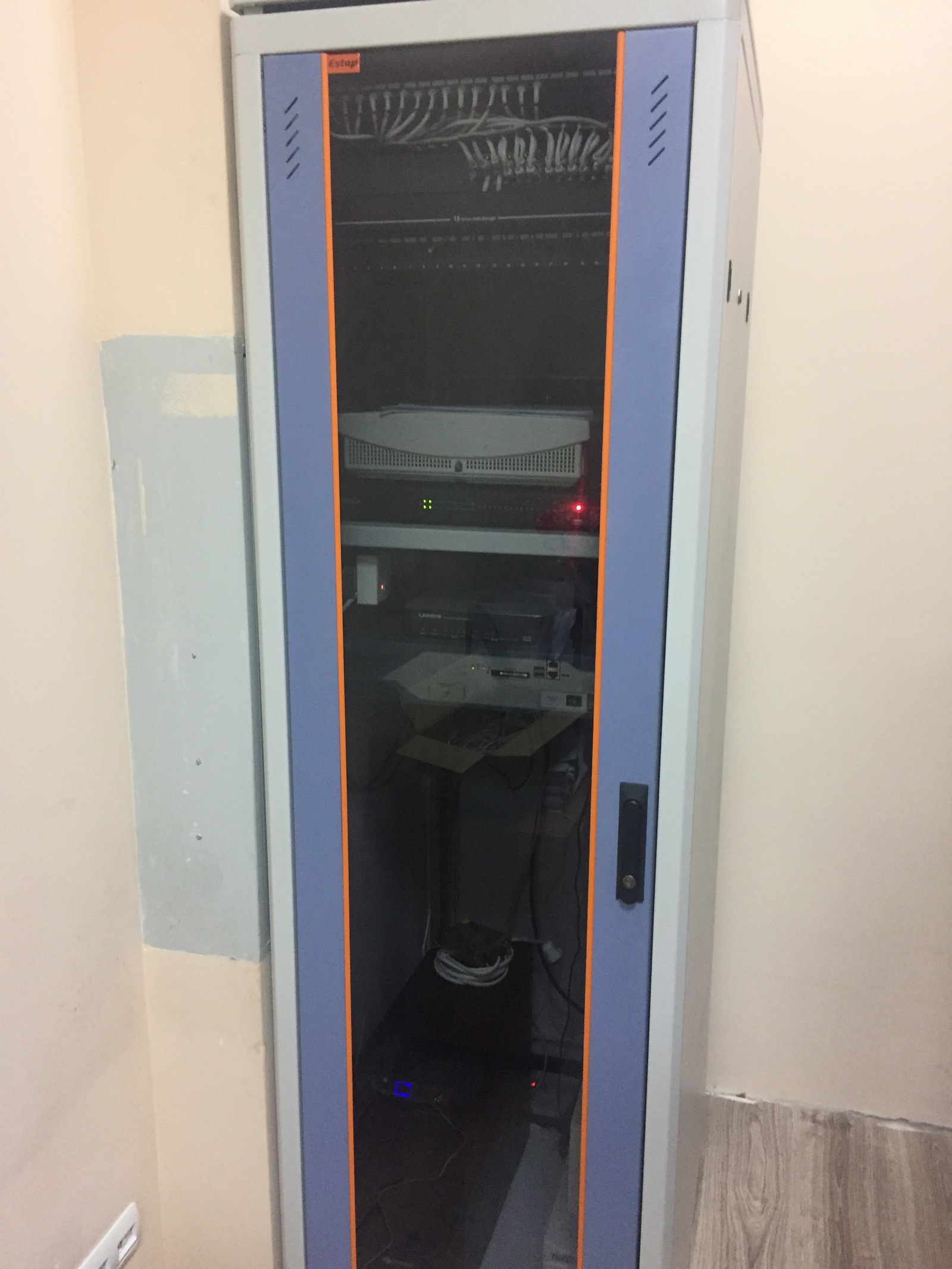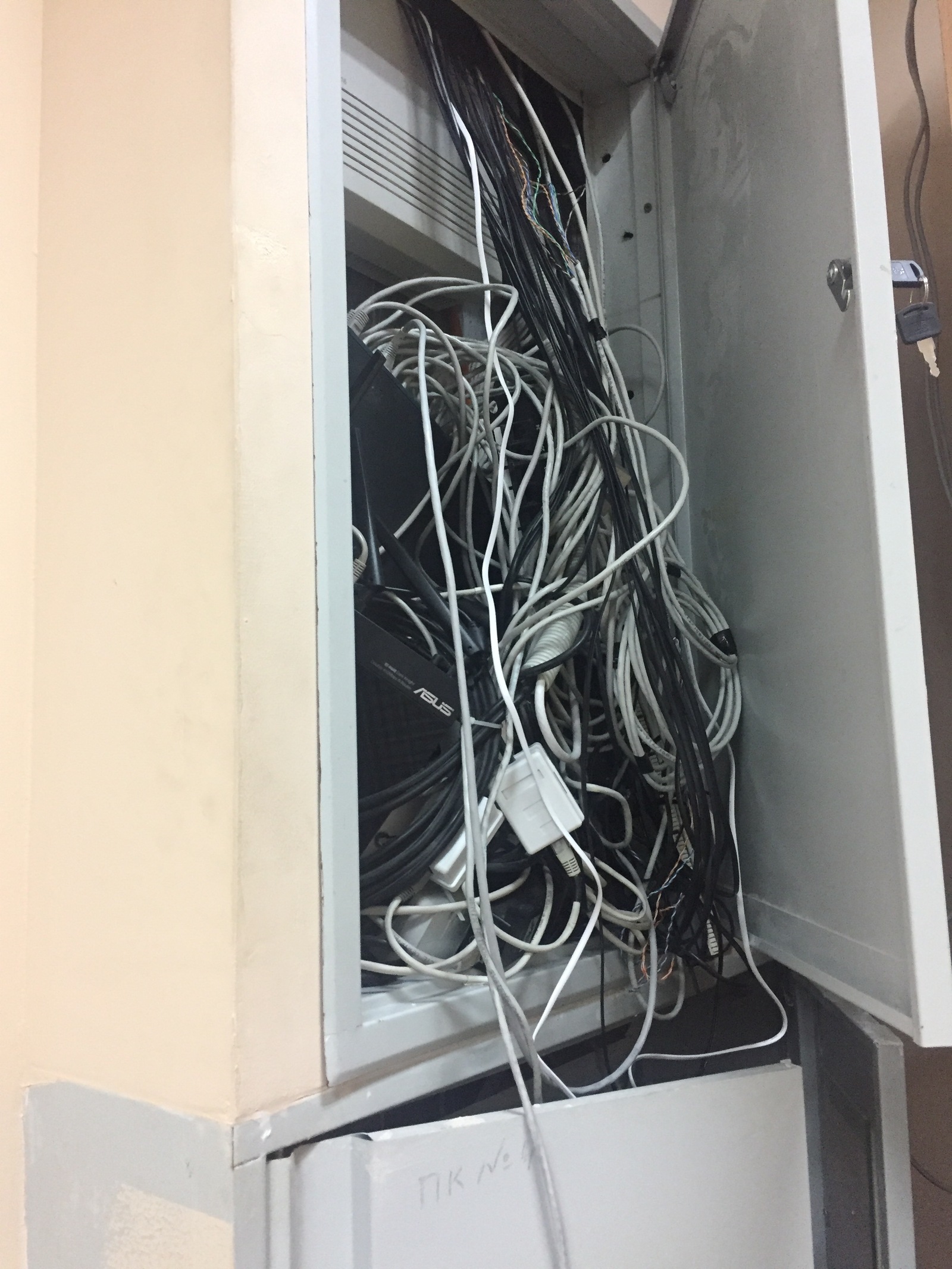Понятие порядка в тех.шкафу у нас на работе отсутствовало как таковое, что видно на первом фото (кстати, это вообще щит пожарной безопасности). Долго ли, коротко ли, уговорил я руководство купить телекоммуникационный шкаф. Однако чтобы его установить, пришлось повернуть шкаф-купе, который во-первых был заполнен документацией до краёв, а во-вторых уже успел прирости к полу. Плюс все работы проводились на выходных, дабы не останавливать работу офиса. Зато сразу +100 к удобству обслуживания. Ну и несколько фото из серии "было-стало". Не ругайте сильно, фоткал на патч-корд