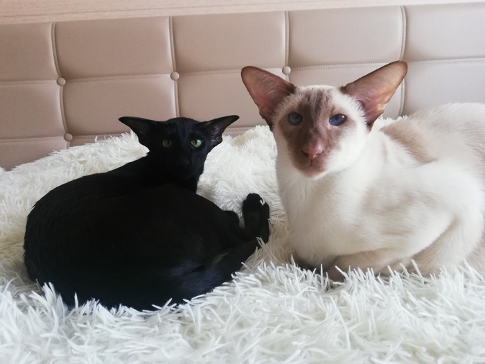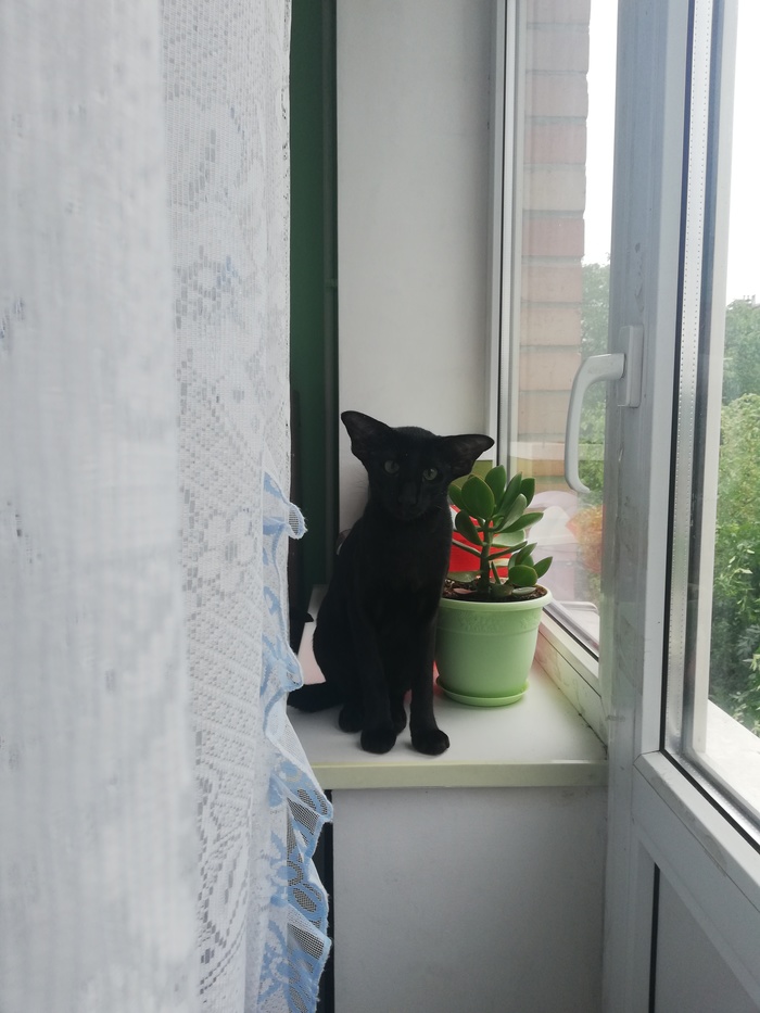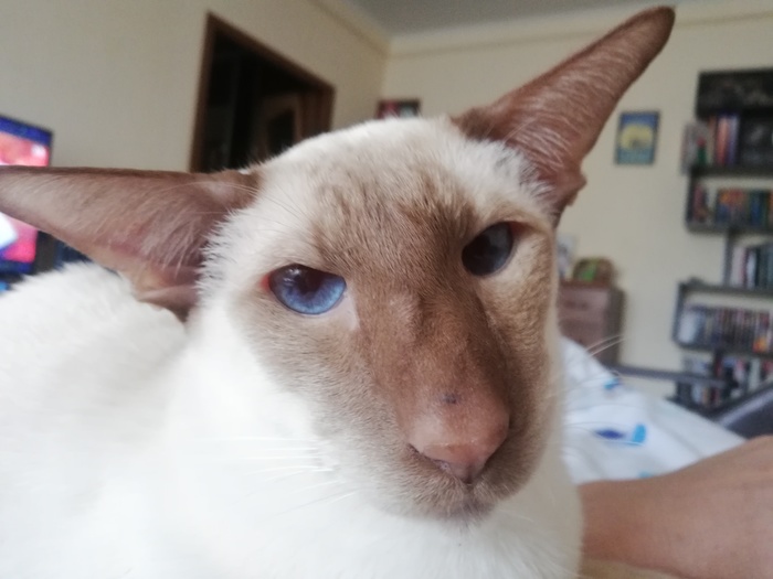 Изначально, муж был против котов ориентальной породы "с высокомерной мордой". Я расписывала плюсы этой породы, а ему все хотелось обычного дворянина. Но была одна проблема - у меня аллергия на кошачью шерсть. У ориков она короткая и почти не имеет подпушка. А шерсть обычных кошек вызывала у меня чихание и сильный насморк. И тут, нашей начальнице, тоже поклоннице ориков, отдают взрослого кота сиама, почти ориентала. Когда он только приехал, мы с ним пообщались, сфотографировались.