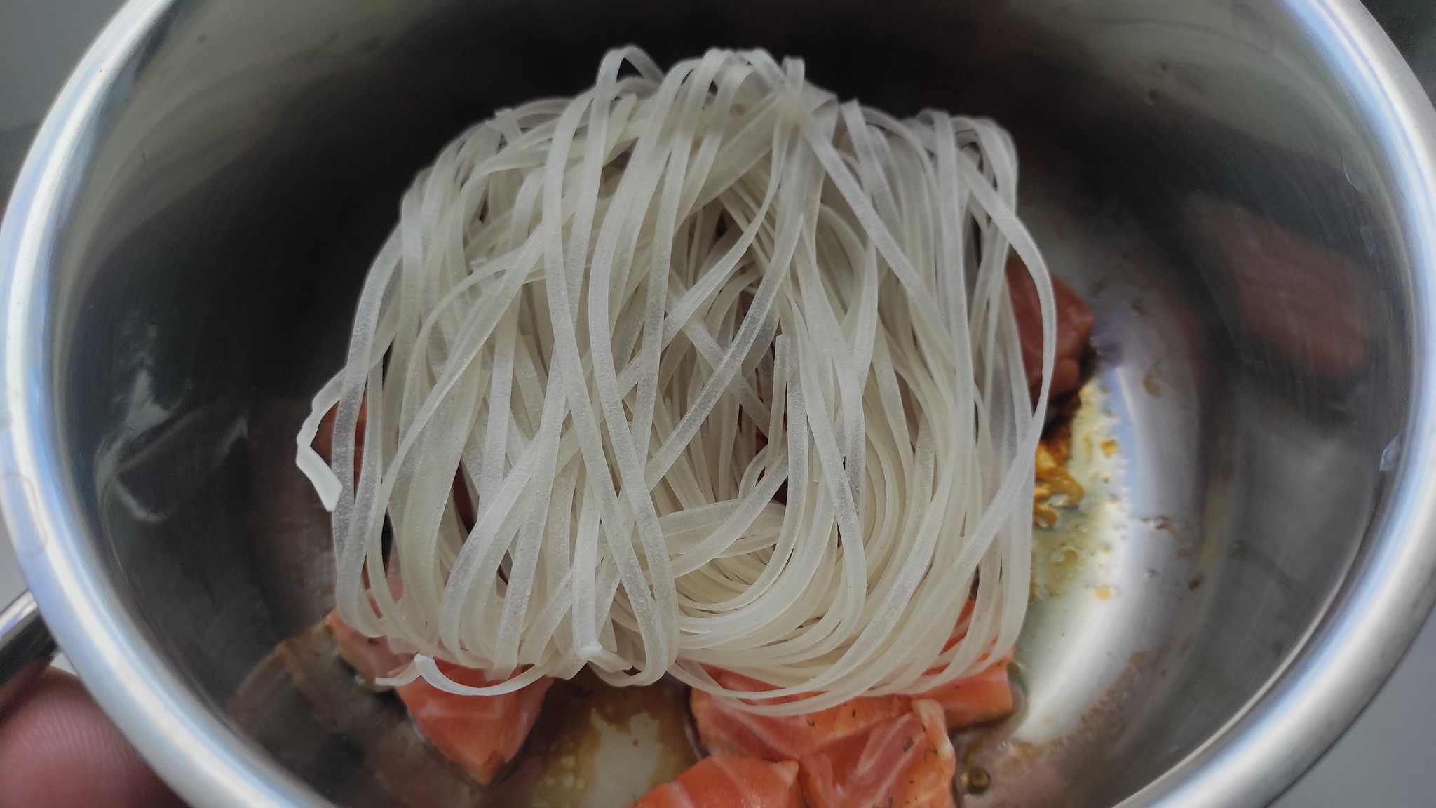Нагрел кастрюльку с толстым дном и добавил туда соевый соус, кунжутное масло и рыбу. Нагрел что-бы кастрюля не забрала в себя слишком много тепла когда залью всё кипятком.