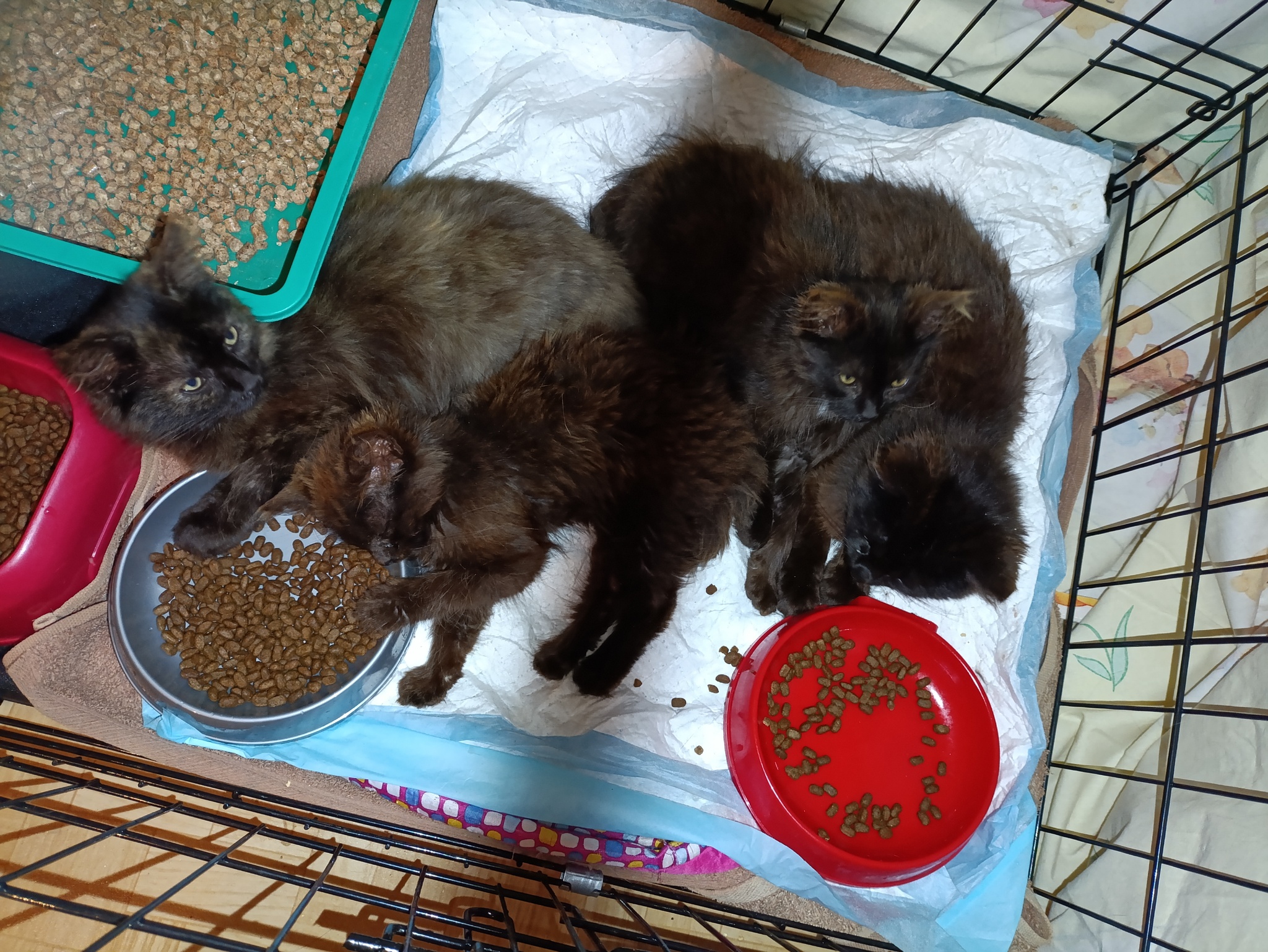 Вот эти четыре малышки с больными глазами, блохами, власоедами, две из которых еще́ и истощенные бегали на очередной точке, куда Лена приехала по работе...
