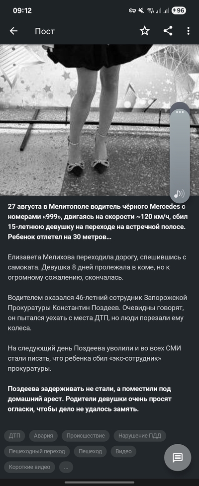27 августа в Мелитополе водитель чёрного Mercedes с номерами «999», двигаясь на скорости ~120 км/ч, сбил 15-летнюю девушку на переходе на встречной полосе. Ребенок отлетел на 30 метров…
