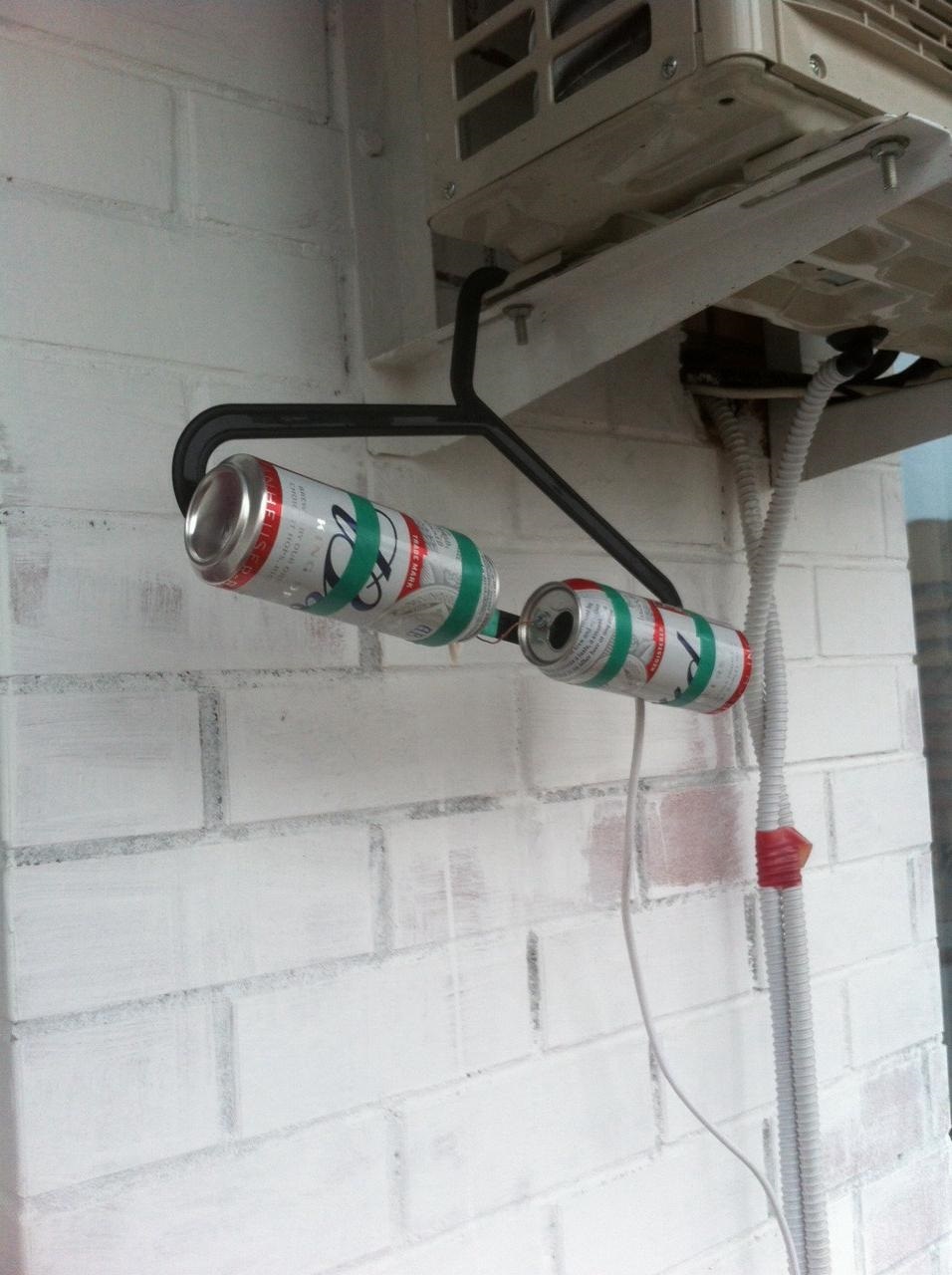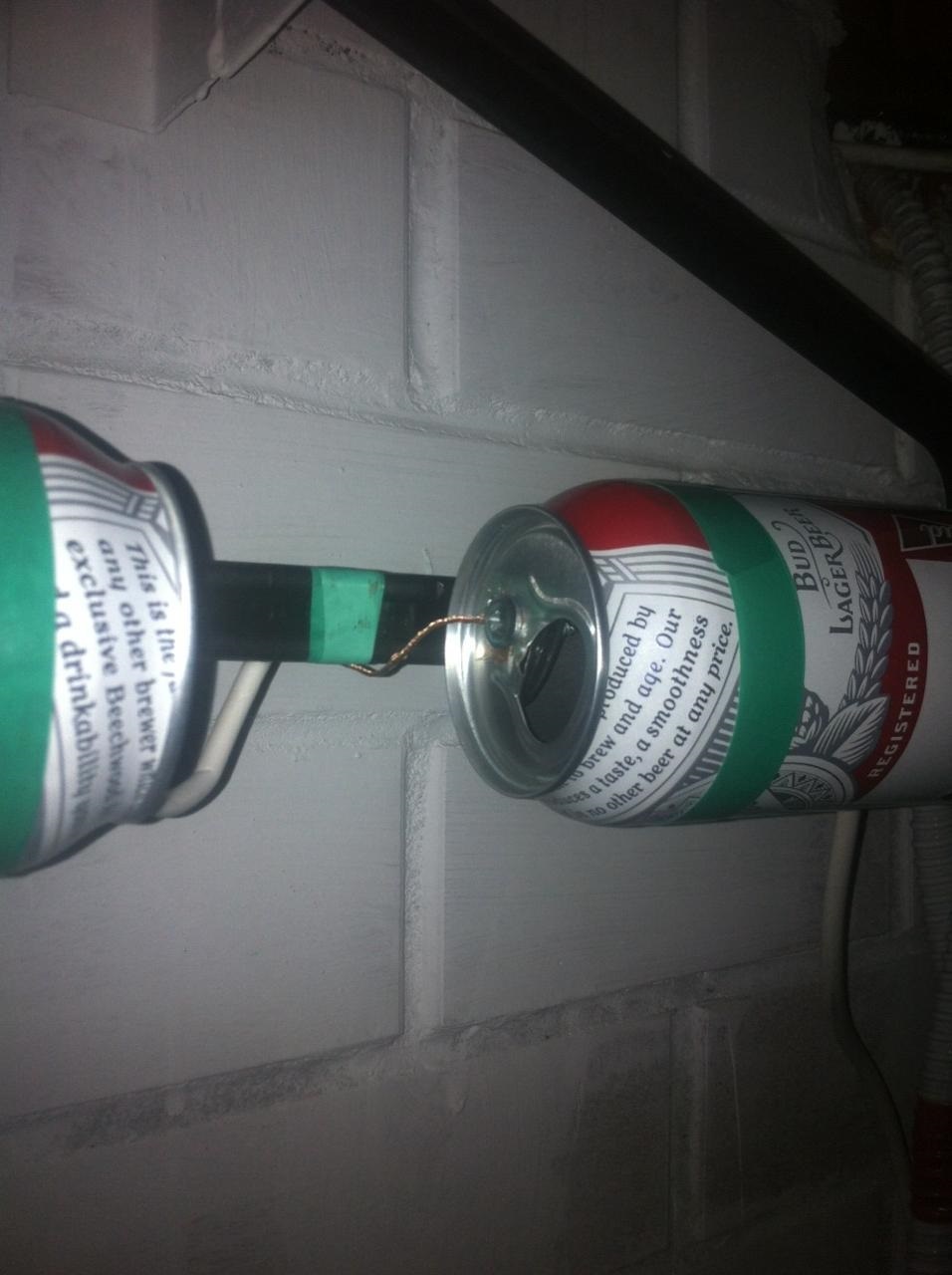 Бахнул одну банку. На вешалке ножиком сделал две отметки, расстояние между которыми составило 75мм. Зачистил 100мм кабеля. Бахнул вторую банку. В обе банки наживил шурупы. Прикрутил изолентой по заранее намеченным отметкам банки, расстояние между ними составило повторю 75мм. Прижал кабель шурупами.