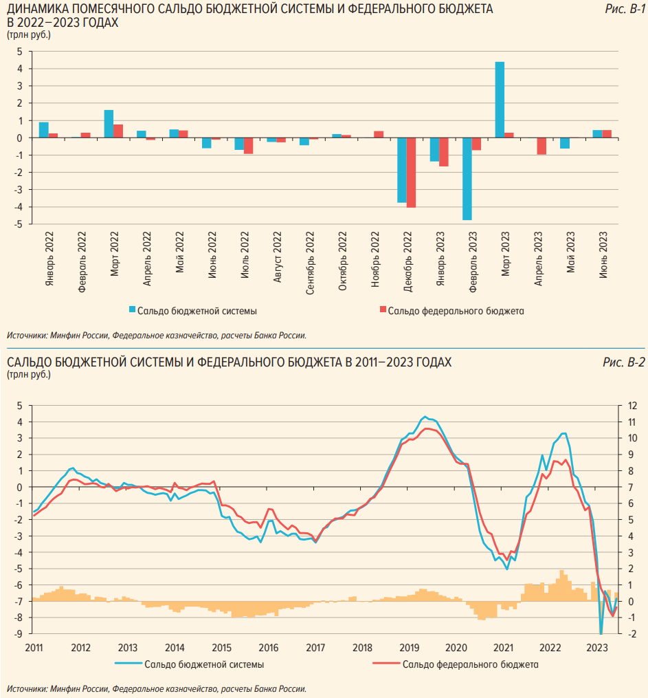 Кроме того, для влияния бюджетной политики на динамику спроса и денежные агрегаты важную роль играют особенности исполнения бюджета в 2023 г.: переход на режим единого налогового платежа (ЕНП) и интенсивное авансирование будущих расходов посредством пополнения остатков на счетах бюджетополучателей в федеральном казначействе без фактического доведения средств до экономики.