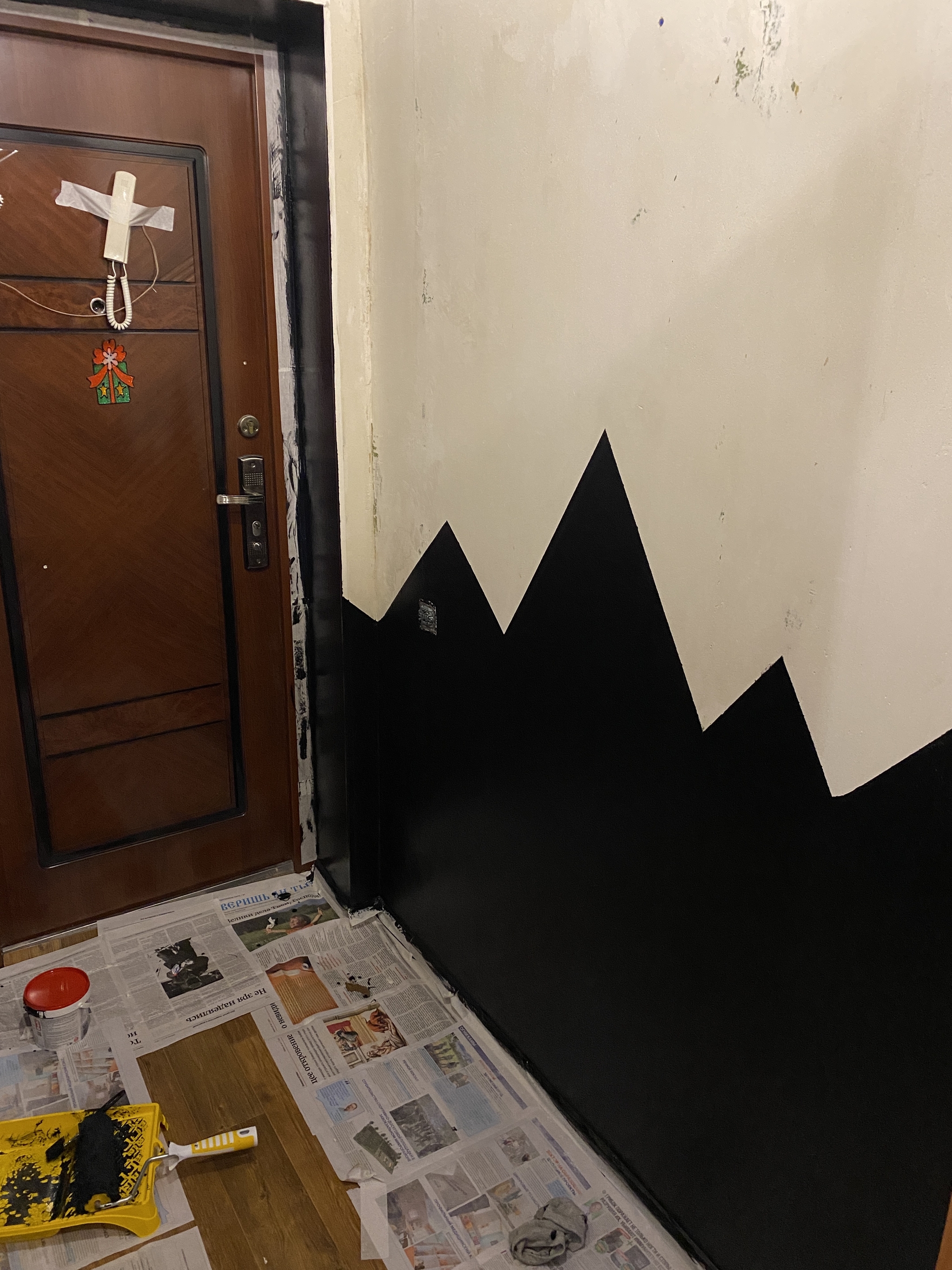 Итого: 3 л грунтовки, 2 мотка малярного скотча, 2 кг черной краски, 1 кг серой, 1 кг белой и ворох валиков, кисточек и лотков. В сумме около 5 к вечно деревянных, и около 6 дней выходных.