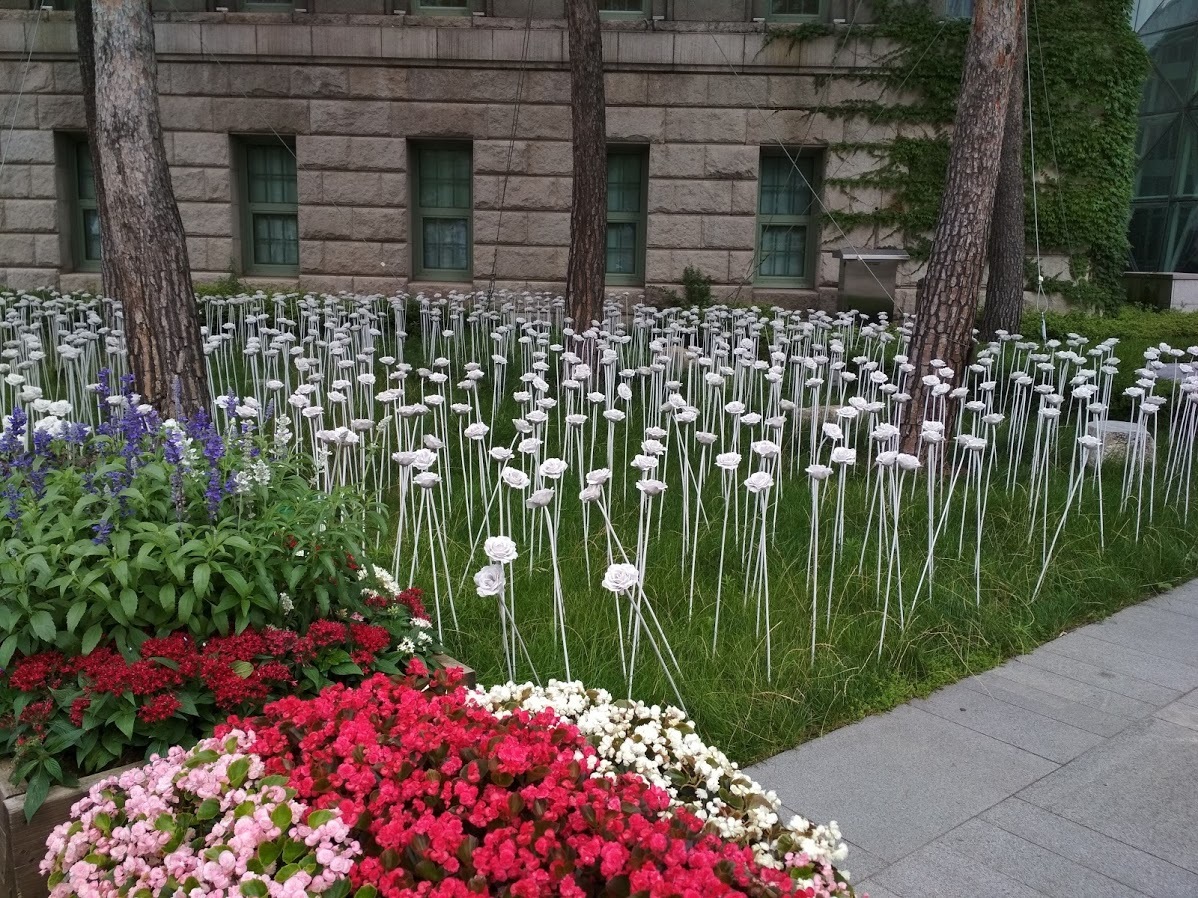 Какие-то металлические (но это не точно) розы. Целая поляна ими утыкана, подозреваю, что они еще и светятся вечером.