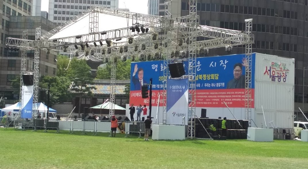 На площади попала на начало какого-то концерта, подозреваю речь шла об объединении и дружбе Корей, судя по фотографиям лидеров стран на сцене.