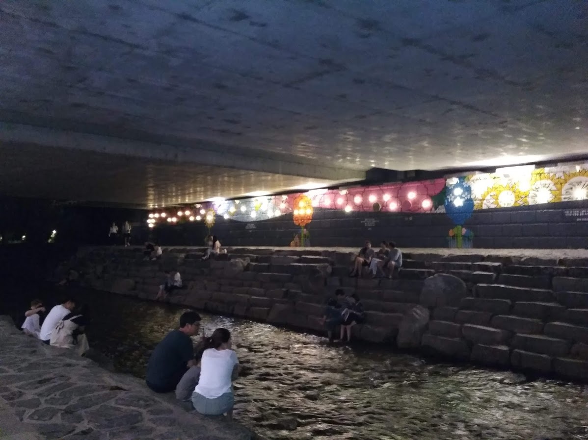 Это просто уличные объекты, где-то по дороге между Чонгечоном и Мёндоном. Ходить одной по ночам вообще не страшно, всё освещено и как-то прям спокойно на душе. Вдоль ручья катаются дедули в жилетках и с фонариками, видимо что-то вроде дружинников. Ну и конечно совсем по закоулкам я не лазила, только по основным улицам.