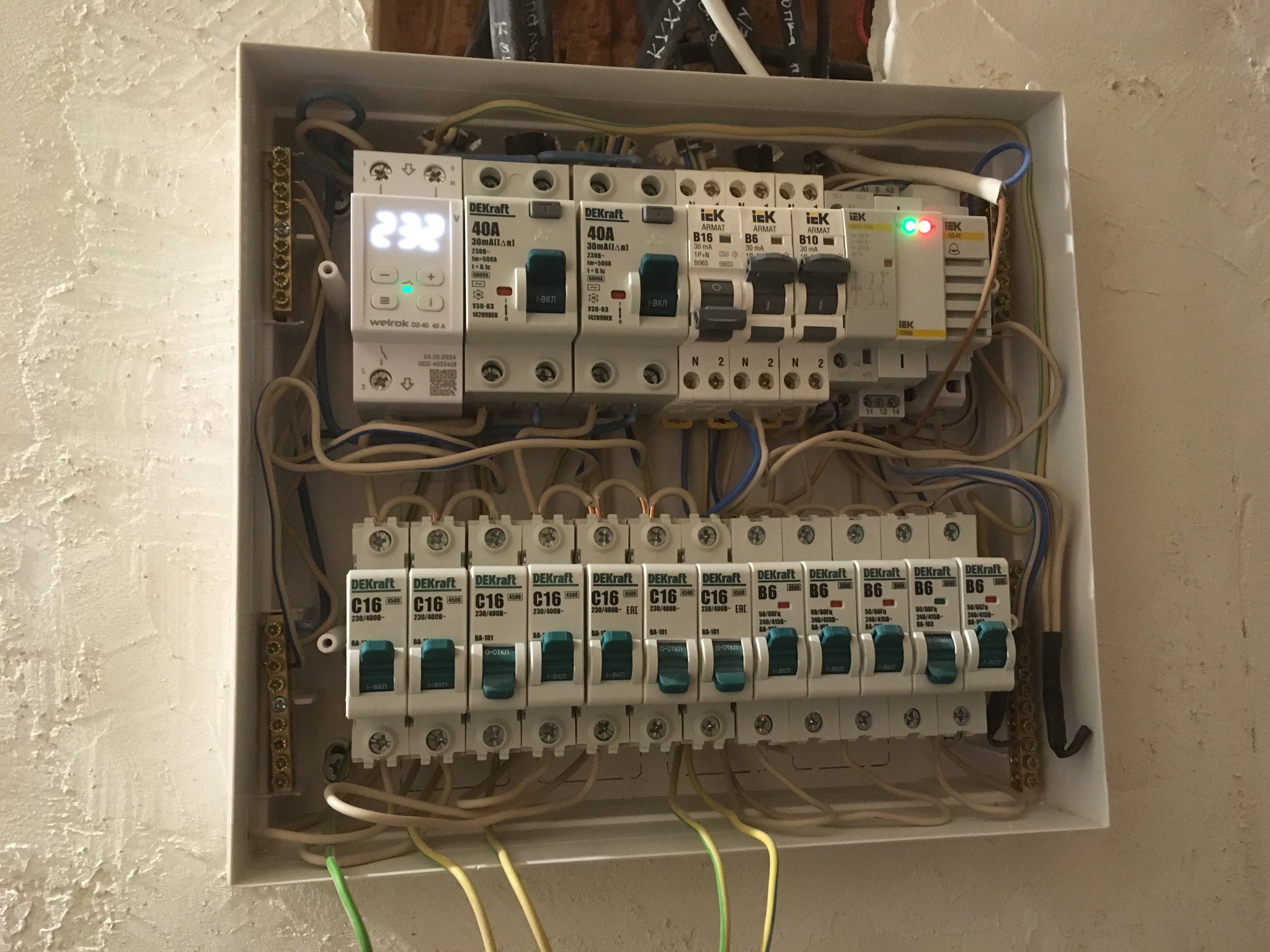 По стоимости получилось около 20к, дорогие Иековские "арматы" купил за треть цены с Авито. Щиток выбрал компактный, наполовину утопил, но капец он тесный, походу потом придется снимать рейки и причесывать.