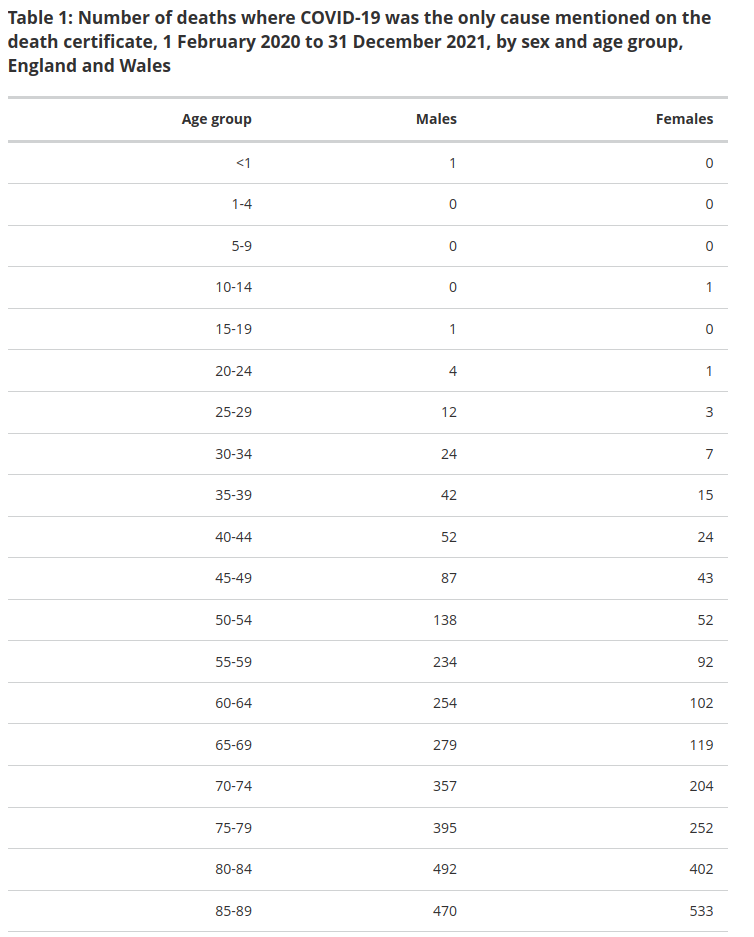«Пожалуйста, укажите случаи смерти, вызванные исключительно COVID-19, где ковид является единственной причиной смерти, указанной в свидетельстве о смерти, в разбивке по возрастным группам и полу в период с февраля 2020 года по декабрь 2021 года включительно».