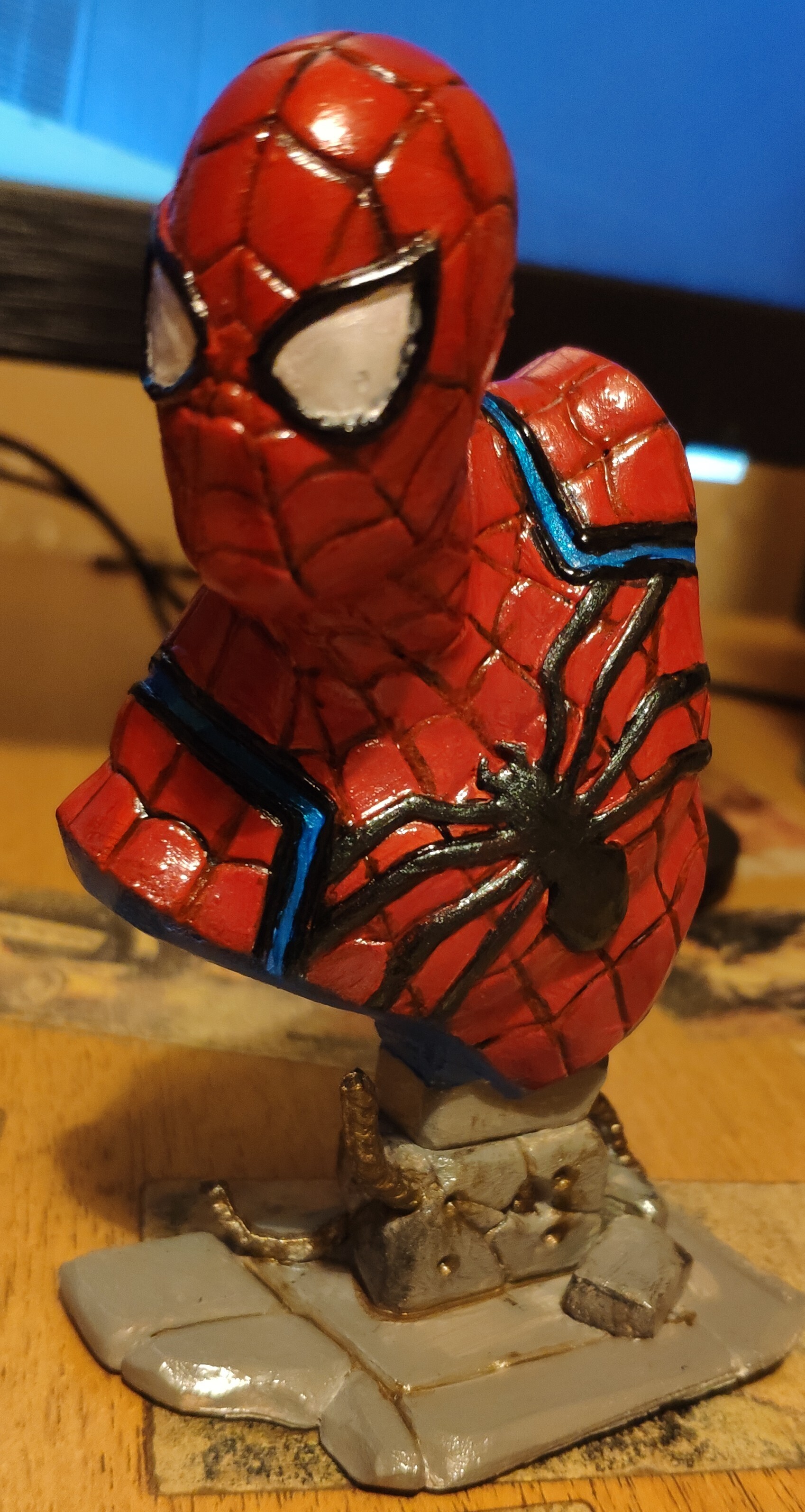 Ну и я вижу, что у вас явные проблемы с паутиной на костюме. Для таких углублений есть специальный тип красок - проливки. Они по консистенции похожи на чернила, не требуют разведения, а в силу своей текучести заполняют любые углубления. Можно было бы нанести чёрную проливку по всей фигуре, а затем подправить красный, или же взять самую тонкую кисть и аккуратно промазать ею все контуры паутины.