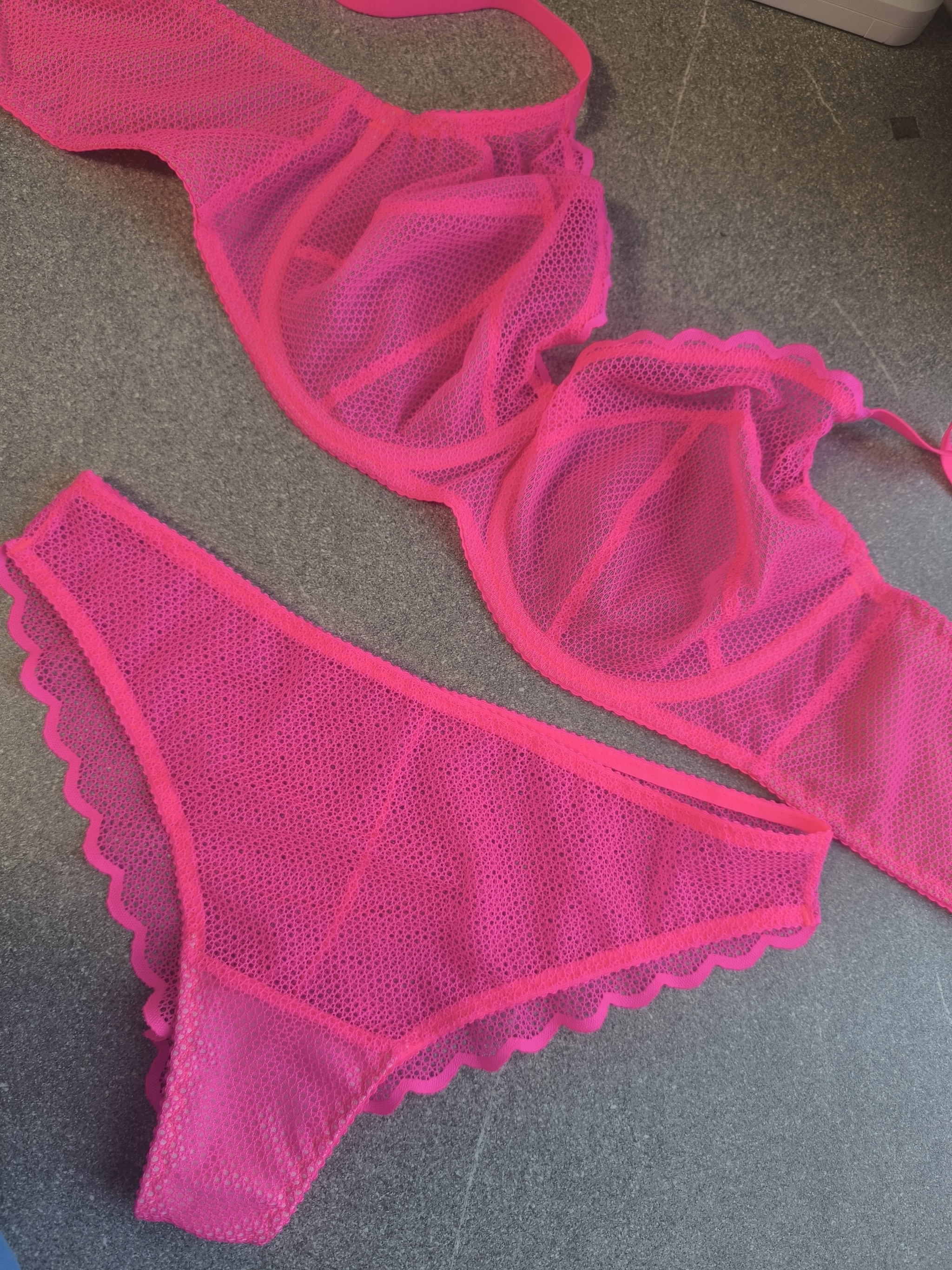 Сегодня яркий неоновый розовый комплект. Основной материал кружево, хотя выглядит как сеточка.. Это тот редкий случай, когда клиентка хотела более естественную форму груди, поэтому вместо привычной шарообразной, мы делали каплевидную форму.