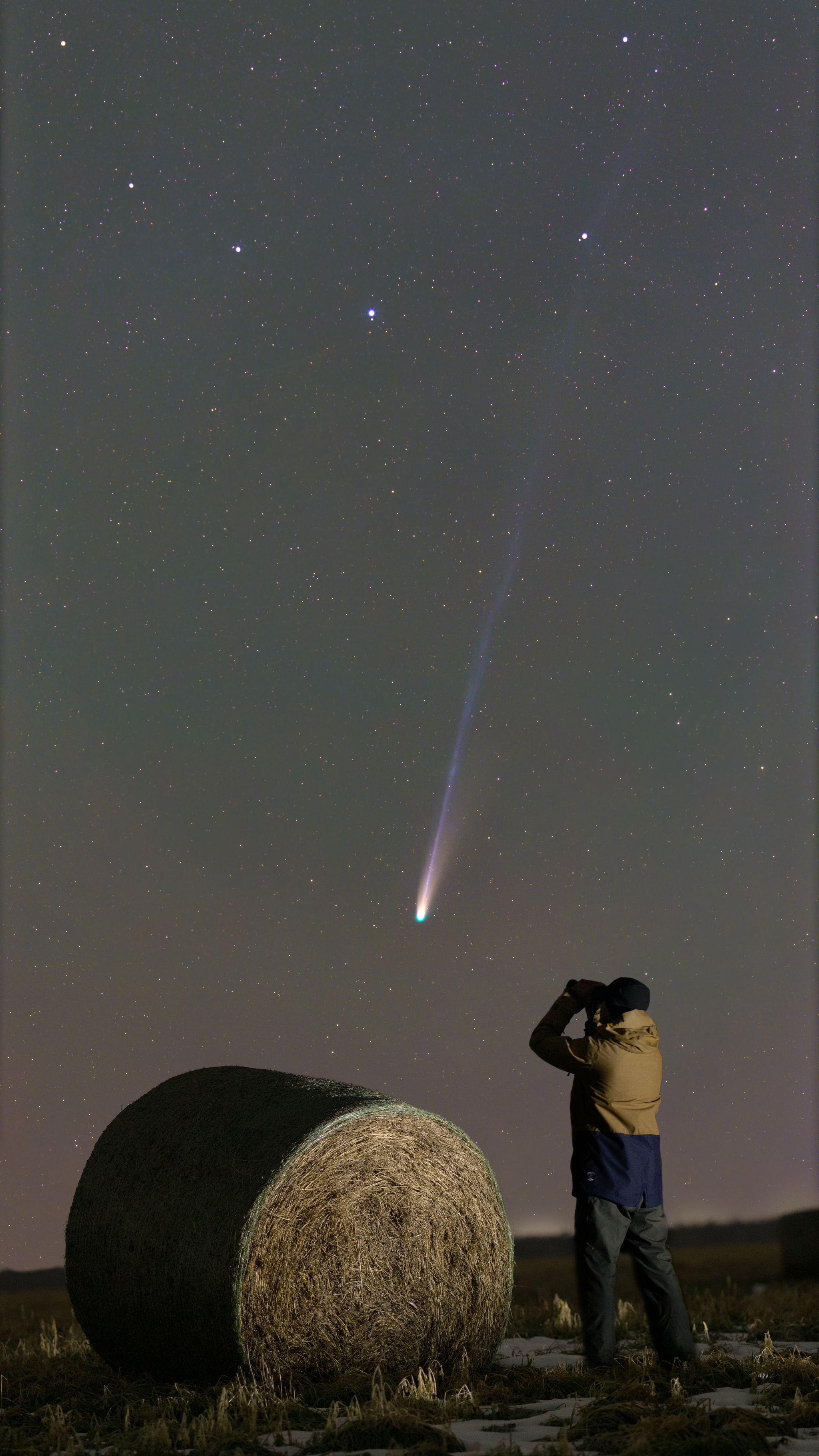 Погода и время позволили выехать на съемку интересной и яркой кометы этого года - C/2025 A6 Lemmon. Для меня новым опытом стало наблюдение за небесными телами в бинокль - это действительно работает ) Невооруженным глазом было видно комету только периферическим зрением, в виде тусклой точки. В бинокль 10х56 отлично видно и комету и газовый хвост, ионный (синий) стало видно только на фотографиях.