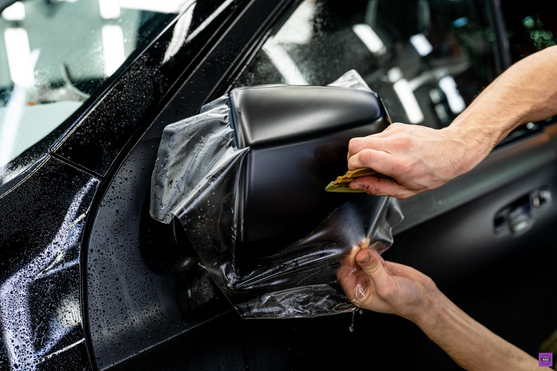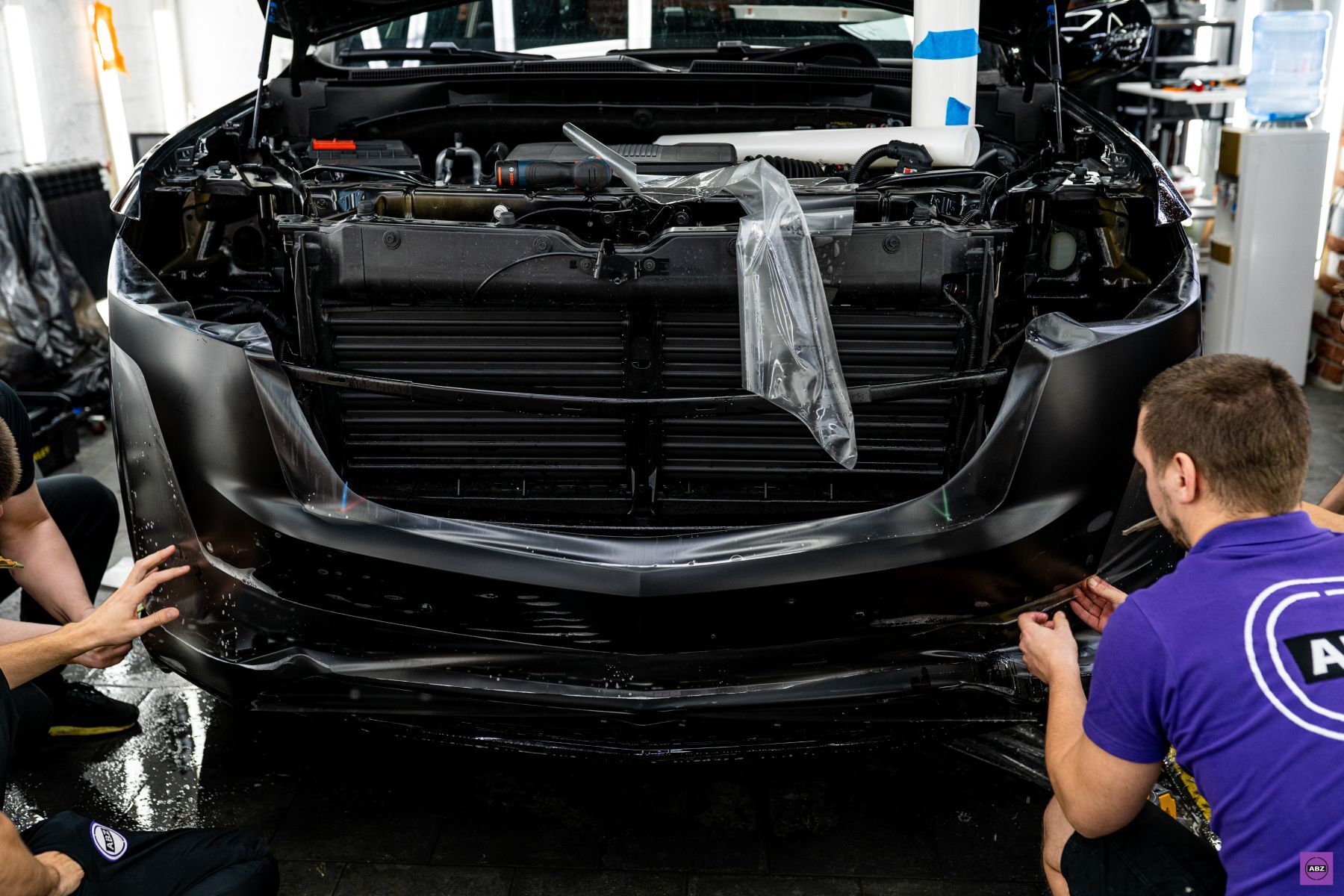 Владелец хотел вместо привычного глянца — матовую защитную пленку на кузов. Такой ход превращает автомобиль в тихого, но очень опасного хищника. А чтобы не перегружать строгость — отдельные детали оставили в глянце. Лобовое мы «забронировали», чтобы встречные камушки не думали, что они здесь главные. Фары и задние фонари — в глянцевую защиту. И, конечно, внутри — все глянцевые элементы салона получили свой щит.