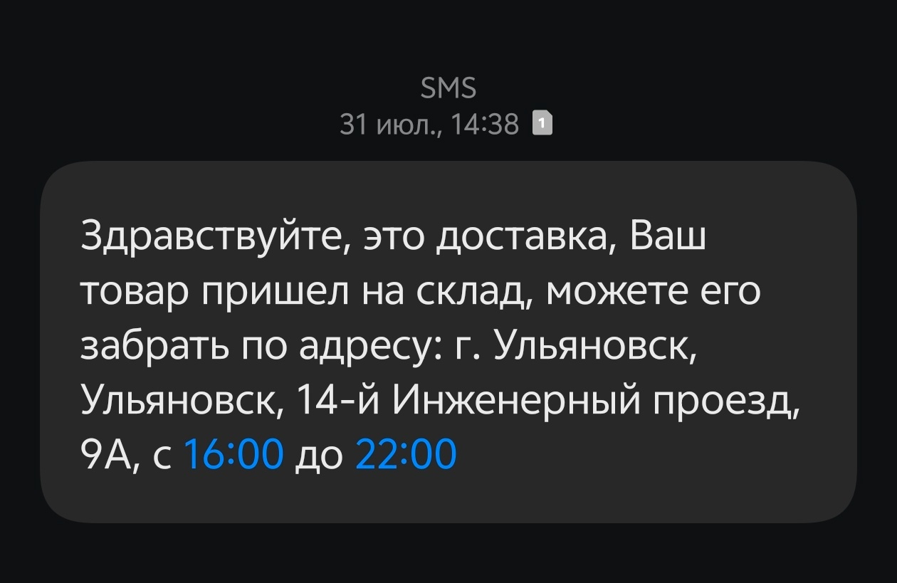 Сама доставка была относительно быстрая, по крайней мере в этот раз не было недельных зависаний, это можно отметить как плюс. Единственный. В день предполагаемой доставки приходит такое сообщение: