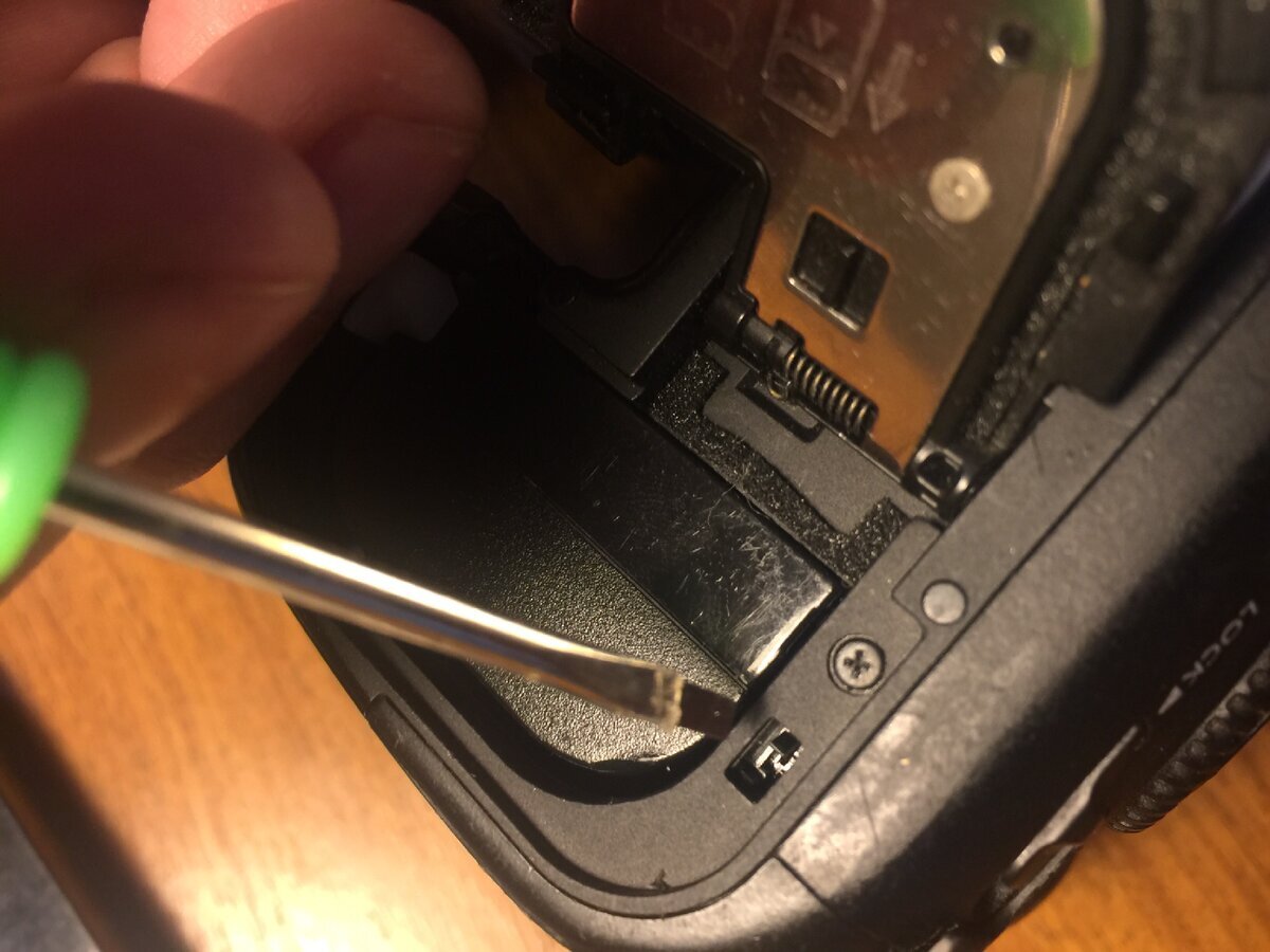 Однако в моём случае не помогло. Зато помог рецепт из этого видео. Оказывается под крышкой для флэшек так же есть концевик и без нажатого концевика аппарат не включается и не подаёт признаков жизни. Собственно вот он.