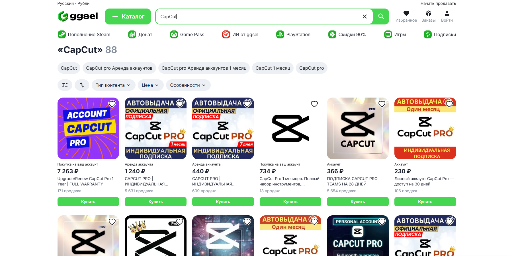 2. GGSEL — купить подписку Capcut Pro с выбором валют