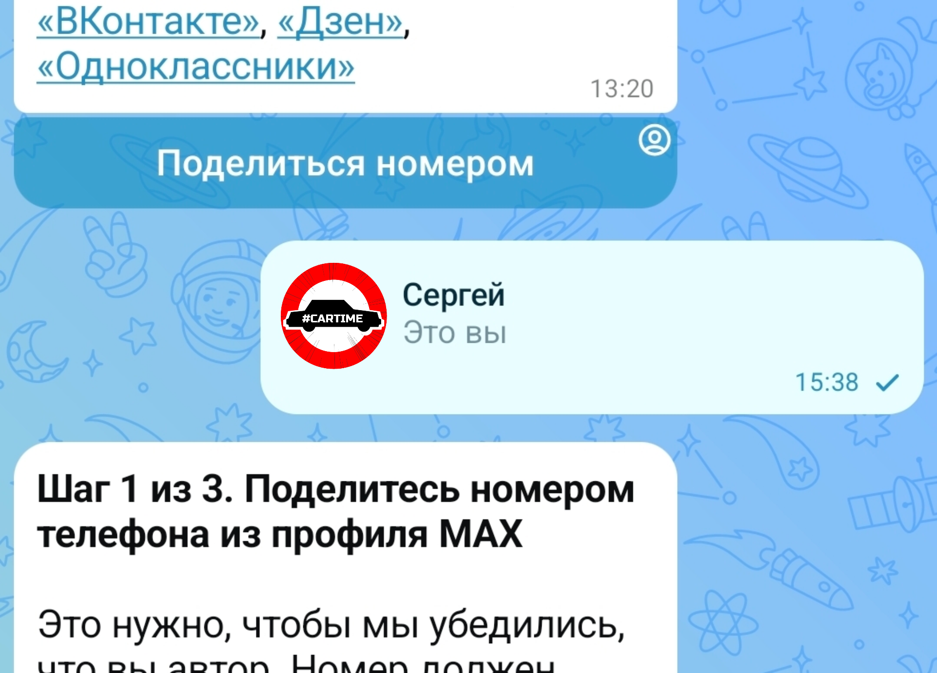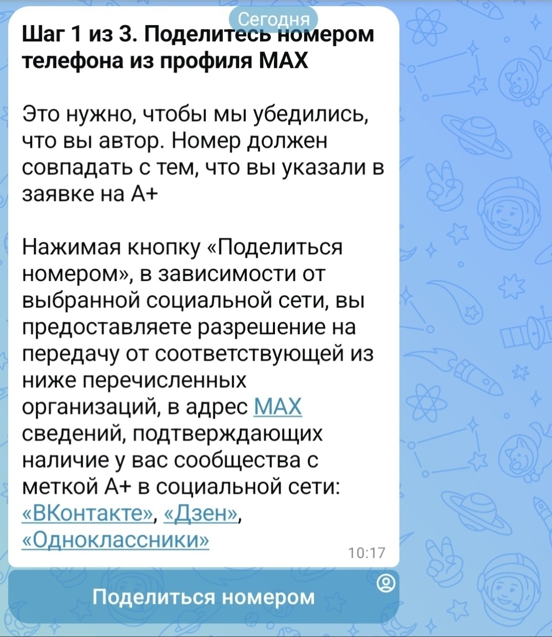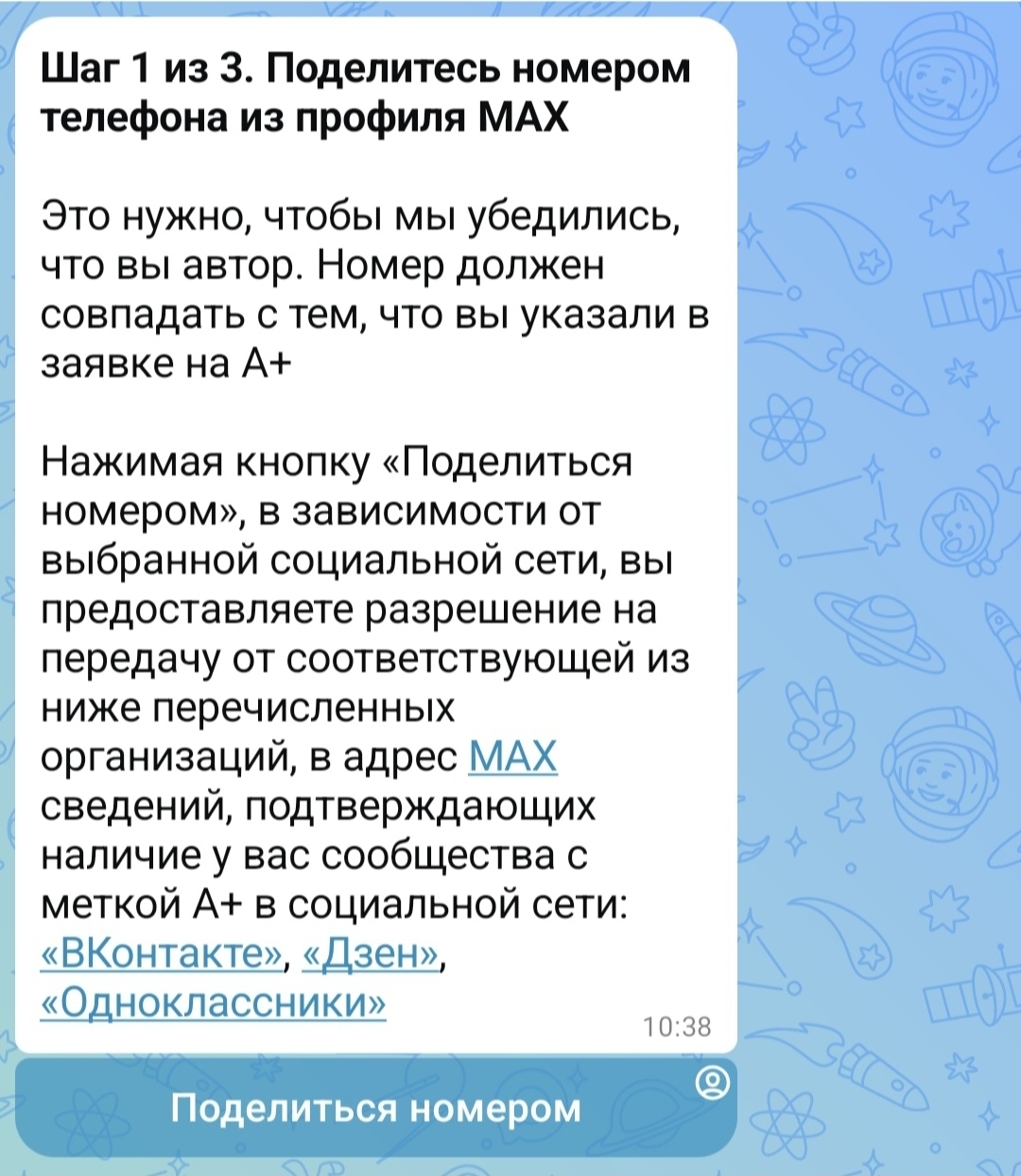 Далее я выбрал площадку — ВКонтакте. После чего попал в шаг 1 из 3, в котором нужно было поделиться с мессенджером Макс номером телефона.