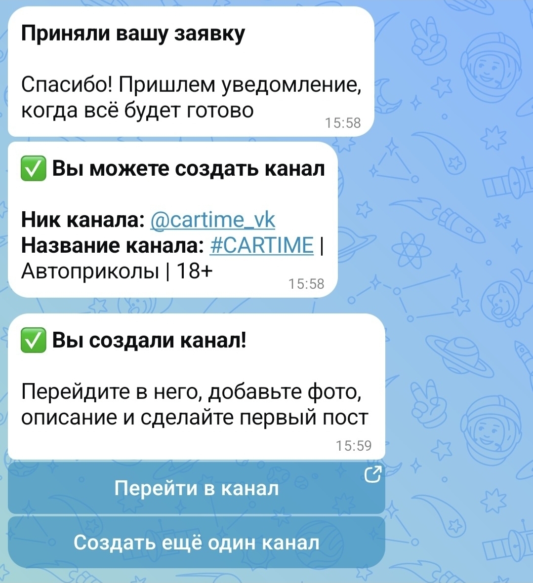 Далее пошли долгие часы ожидания, в которые я периодически предпринимал попытки домогаться до бота, предпоследняя из которых была в 15 часов 38 минут или через 5 часов и 21 минуту после первой попытки создать канал.