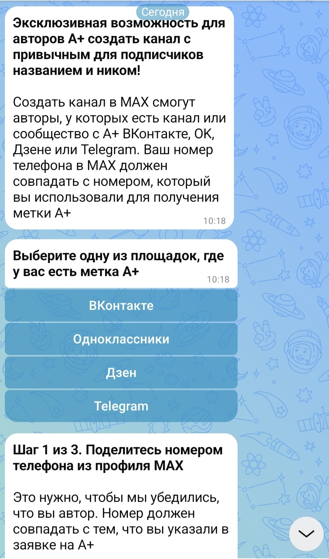 И вот вчера от большого безделья я решил всё же создать канал в мессенджере Макс. Пусть будет — есть и пить не просит. Зашёл в специального бота и нажал кнопку "начать". На часах было 10 часов 17 минут.
