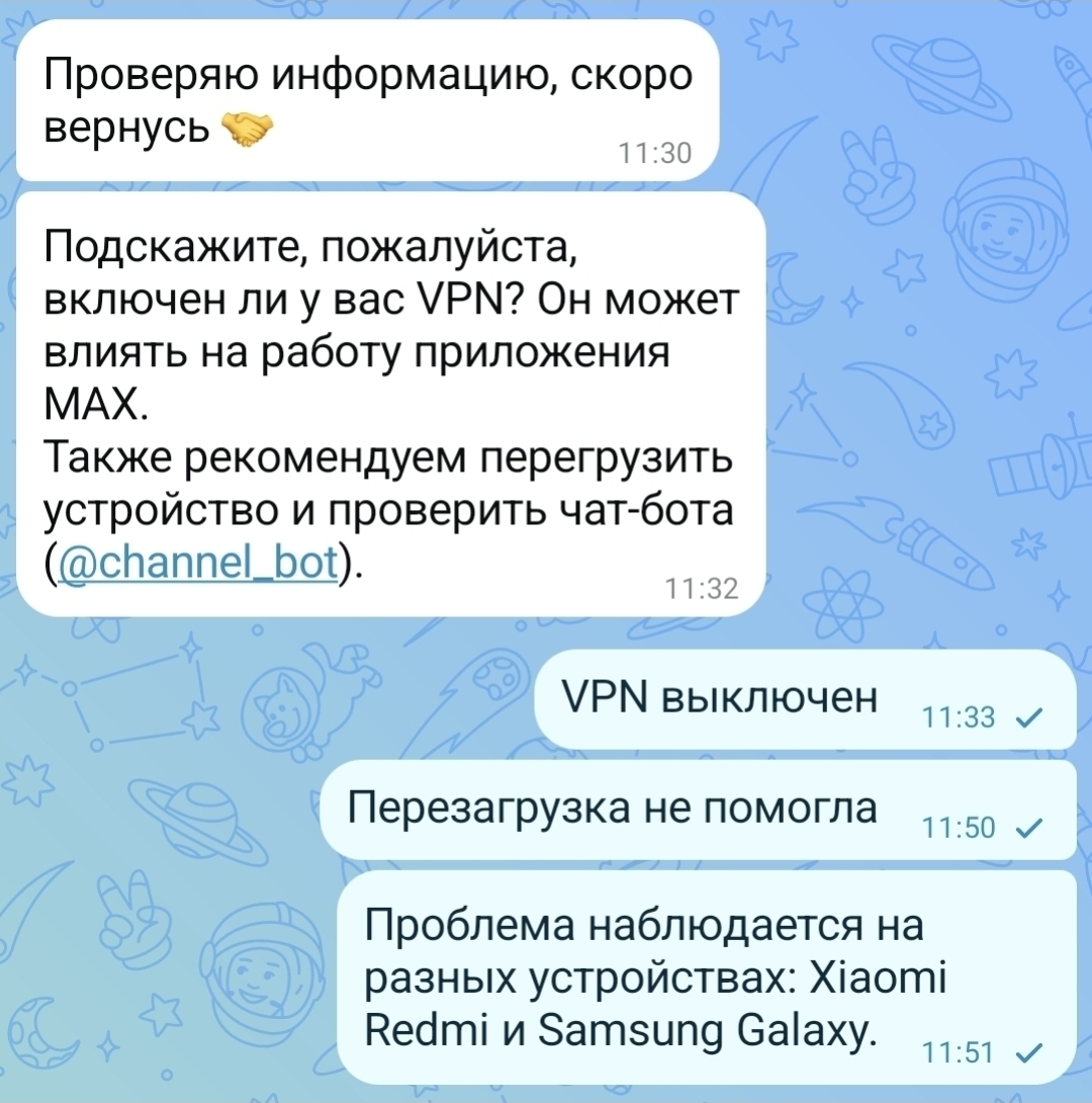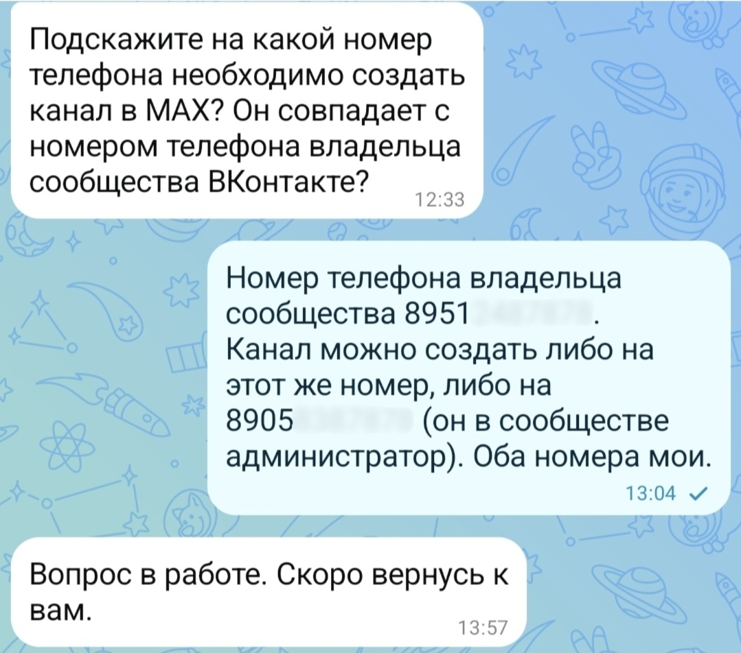 После этого последовал уточняющий вопрос, видимо с целью удостовериться в совпадении номеров телефонов, привязанных к сообществу ВКонтакте, регистрации РКН и аккаунту в мессенджере Макс. На вопрос я ответил исчерпывающе. А агент вновь ответил, что вернётся с ответом когда-нибудь. На часах тем временем 13 часов 57 минут или 3 часа и 40 минут спустя после начала процедуры создания канала.