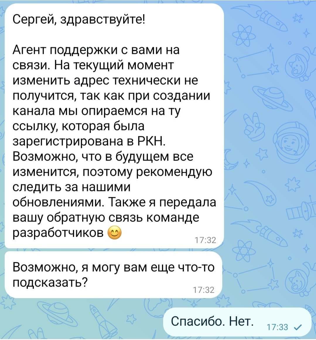 Я отправил ему скриншот из чата с ботом, ссылку на сообщество во ВКонтакте, ссылку на регистрацию в РКН и номера обоих телефонов на всякий случай. Агент попросил меня удостовериться в том, что у меня отключен VPN, а так же перезагрузить телефон.