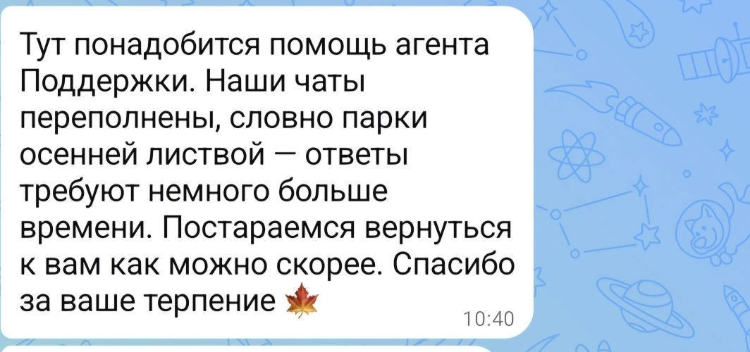 А потом бот и вовсе без каких либо действий с моей стороны начал просто присылать мне это сообщение каждые несколько минут. И ладно бы, хрен с ним с каналом, ну не хочет создаваться и не хочет, мне уже не особо то и хотелось, ну не жили богато и нехуй начинать, как говорится, но постоянные сообщения от бота мне не упёрлись ни в одно место. И я решил обратиться в техподдержку. На часах было уже 10 часов и 34 минуты. С момента первой попытки создать канал прошло 17 минут.
